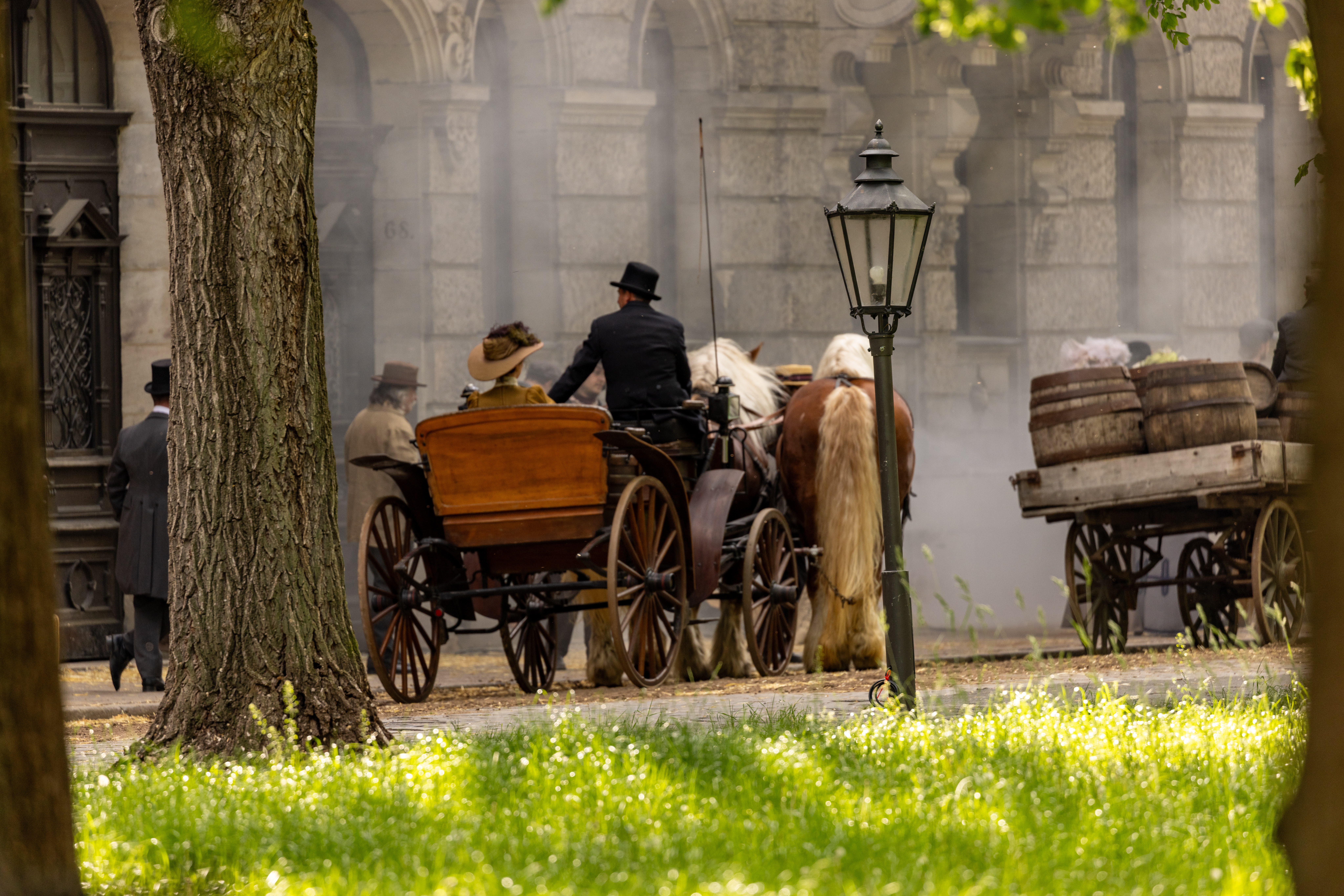 BeschreibungDreharbeiten zu der BR TV-Serie Oktoberfest 1905 in der Hornschuchpromenade, Mai 2024