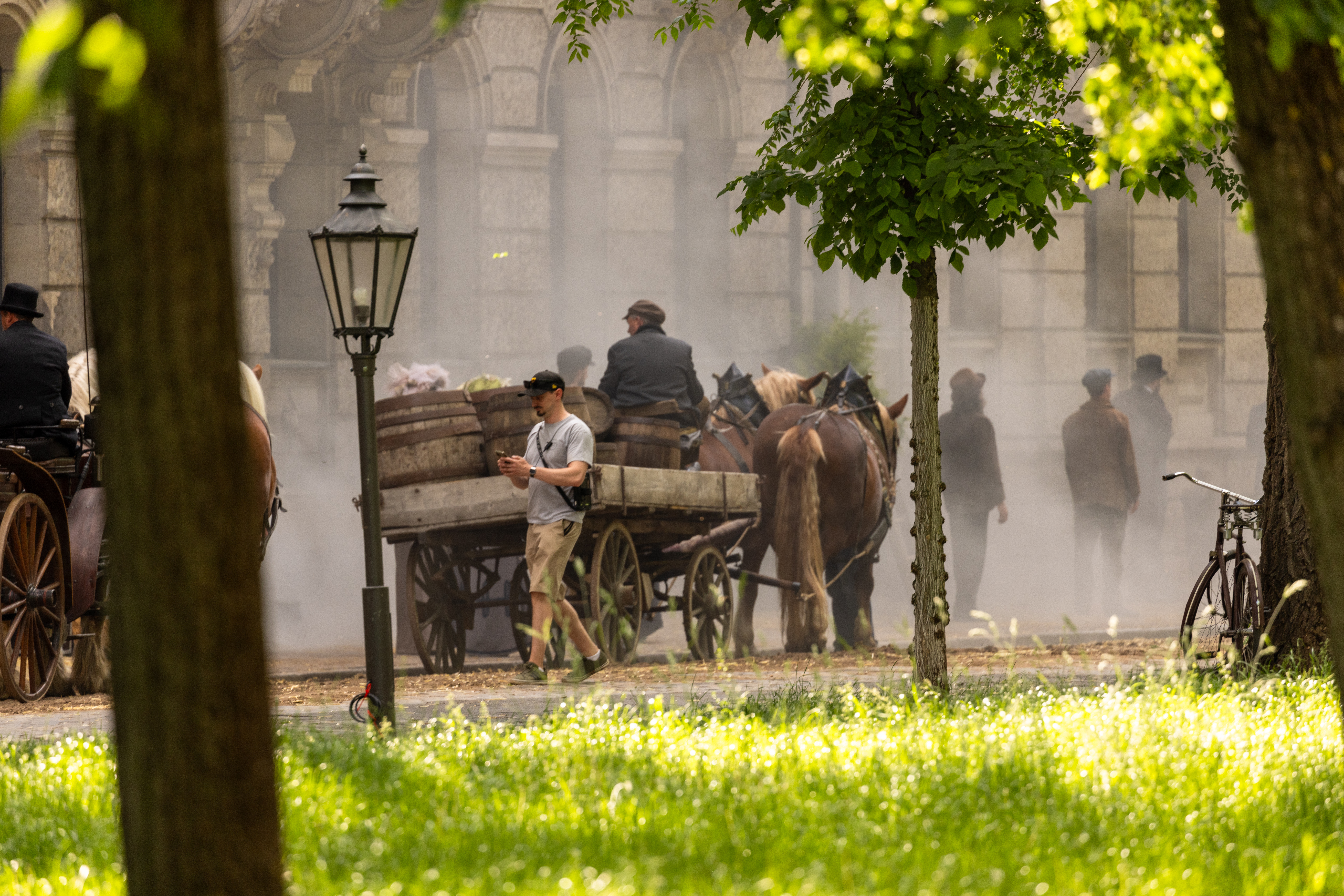 | Beschreibung | Dreharbeiten zu der BR TV-Serie Oktoberfest 1905 in der Hornschuchpromenade, Mai 2024 | ||