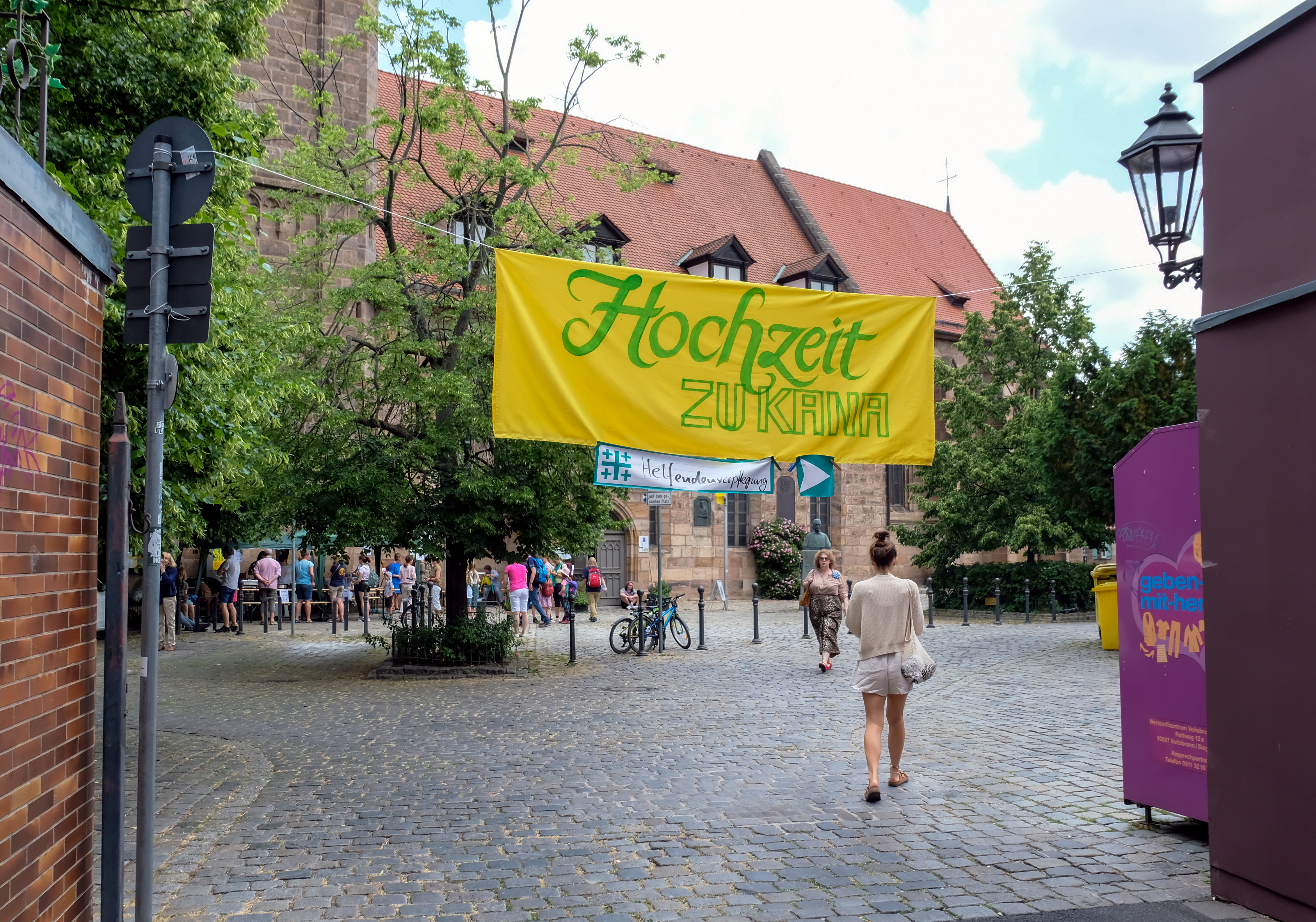 | Beschreibung | Zugang zur Verpflegungsstelle für Helfende des Evang. Kirchentag in Fürth am Kirchenplatz, Juni 2023 | ||