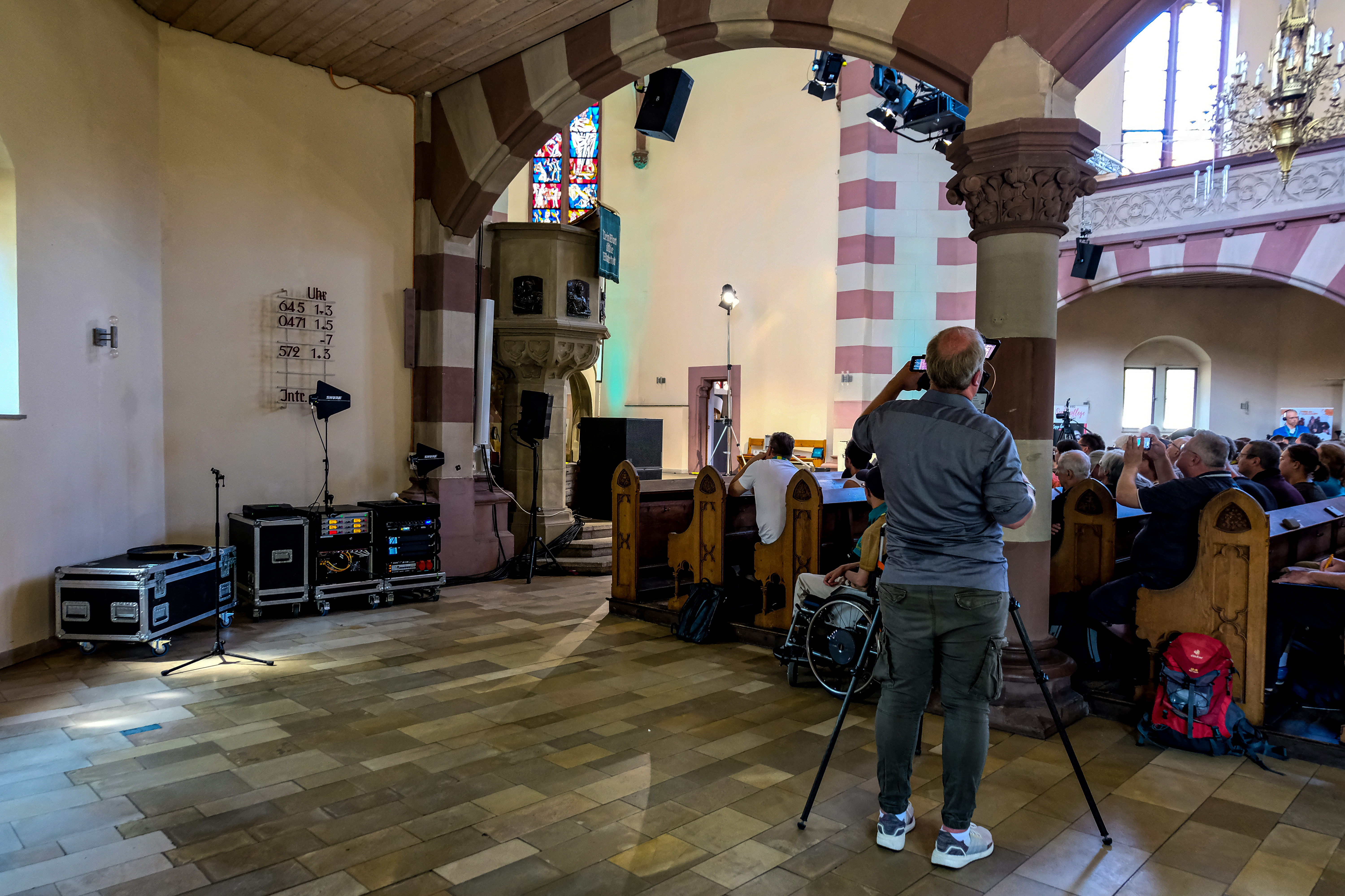 BeschreibungGottesdienst in der Kirche St. Paul mittel einer KI auf der Leinwand während des Evang. Kirchentags, Juni 2023