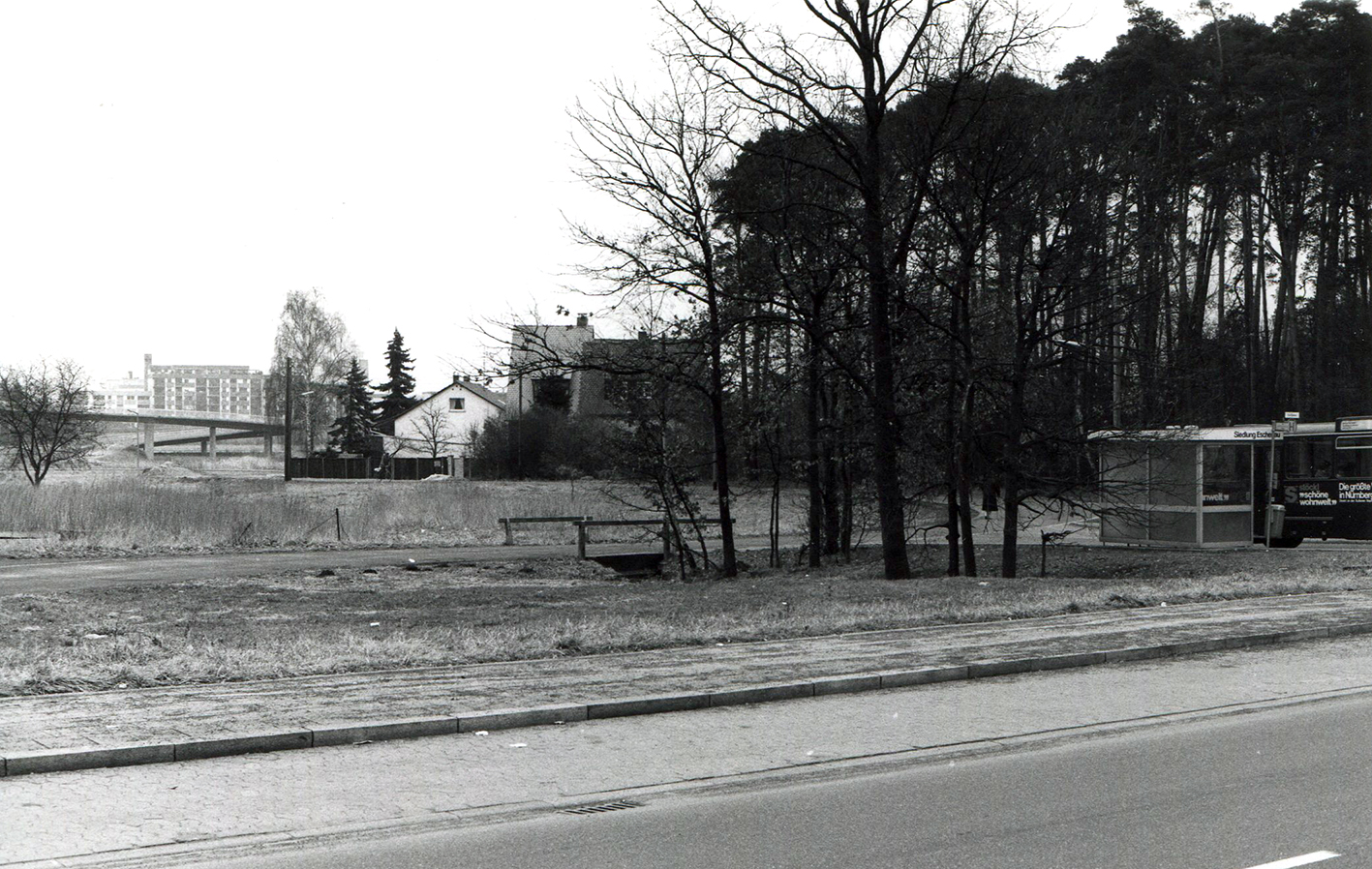 | Beschreibung | Blick von der ehem. Wohnsiedlung in der Eschenau Richtung Main-Donau-Kanal und Eschenausteg, ca. 1988 | ||