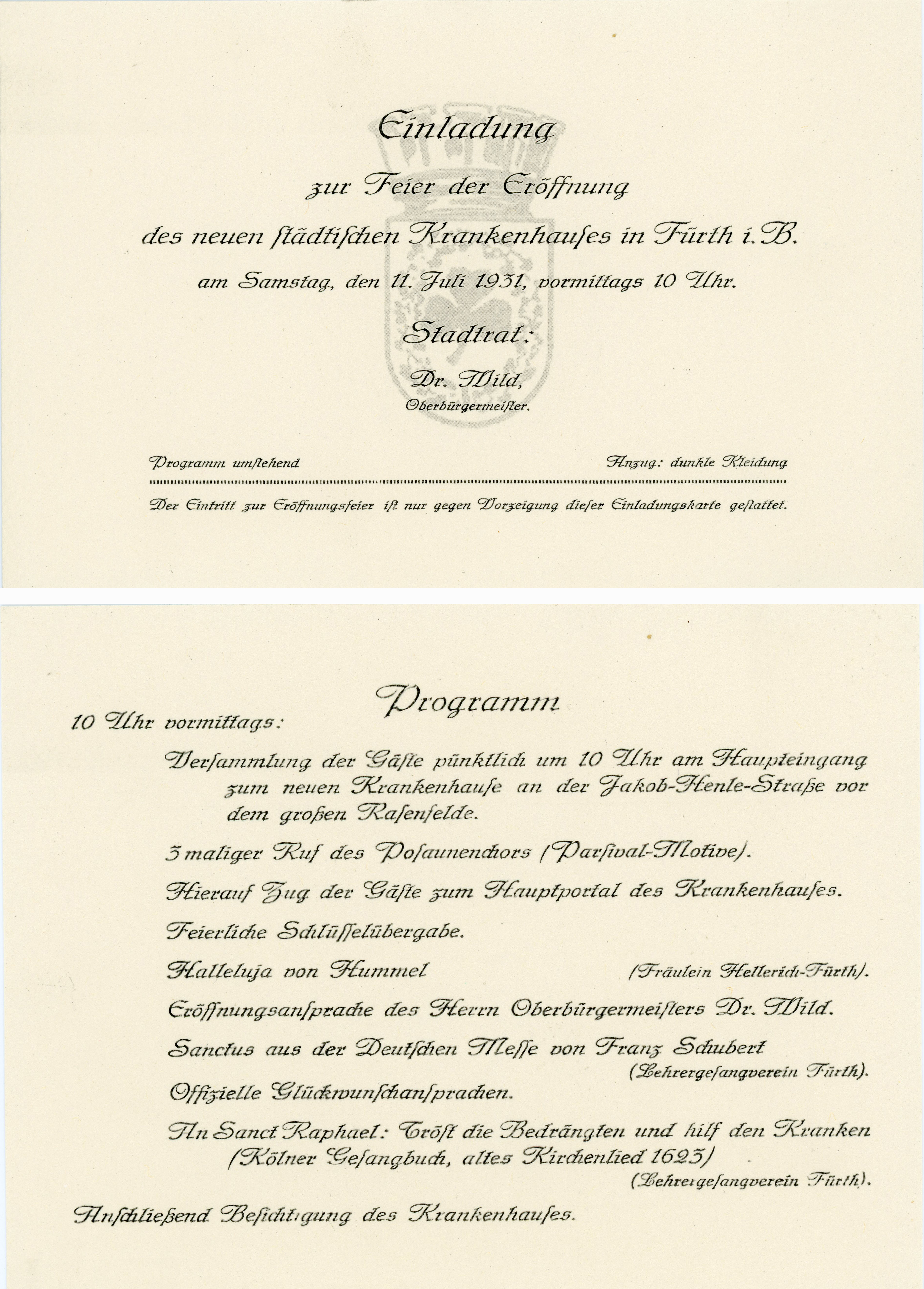 | Dateiinfo (Bild-Unterschrift und Info-Box, automatisch erstellt) | Einladung zur feierlichen Eröffnung des Klinikum Fürth im Juli 1931 Urheber: Klinikum Fürth<br>Erstellungsdatum: 11. Juli 1931<br>Lizenz: cc-by-sa-3.0 | ||
