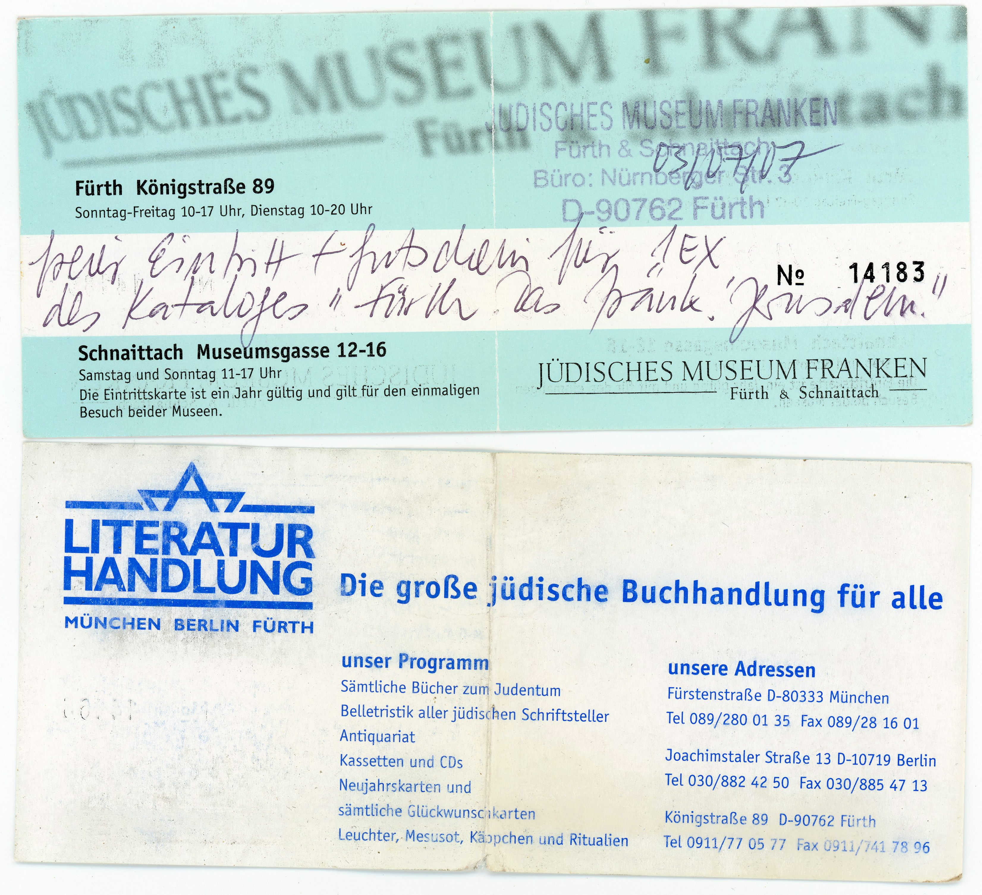 | Dateiinfo (Bild-Unterschrift und Info-Box, automatisch erstellt) | Eintrittskarte zum Jüdischen Museum Franken, Juli 2007 Urheber: Jüdisches Museum Franken<br>Erstellungsdatum: 3. Juli 2007<br>Lizenz: cc-by-sa-3.0 | ||