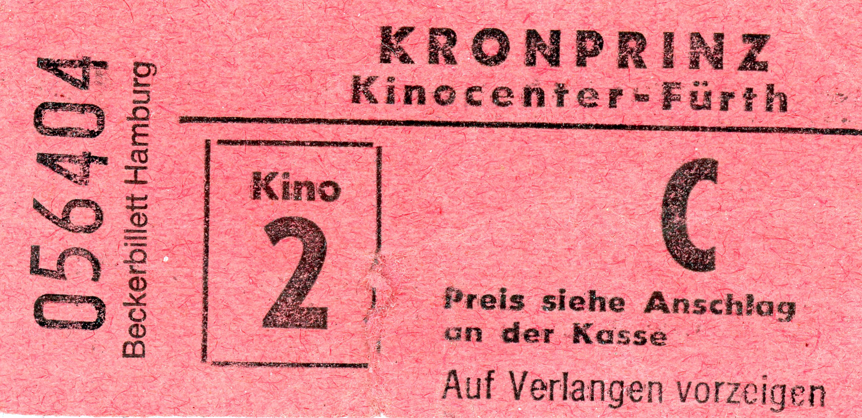 | Beschreibung | Eintrittskarte zum ehem. Kronprinz-Kino, ca. 1990 | ||