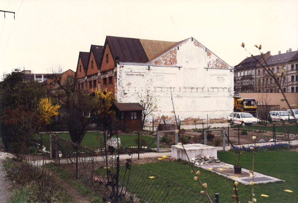 BeschreibungElektrizitätswerk, Südseite des östlichen Erweiterungsbaus, im Hintergrund Häuser der Theresienstraße, 1990