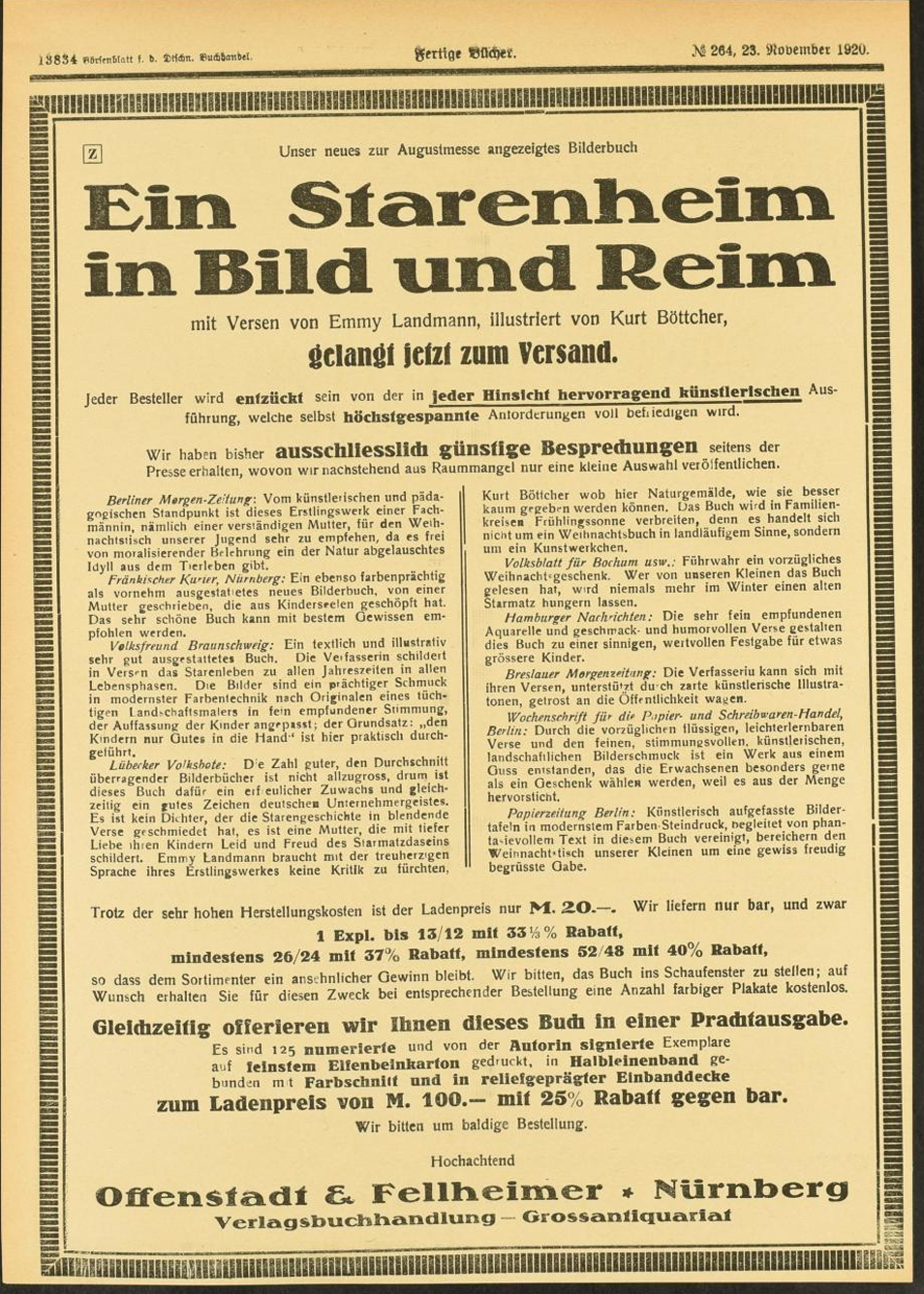 | Beschreibung | Ein Starenheim in Bild und Reim mit Versen von Emmy Landmann, illustriert von Kurt Böttcher, Börsenblatt für den deutschen Buchhandel, 23. November 1920 | ||