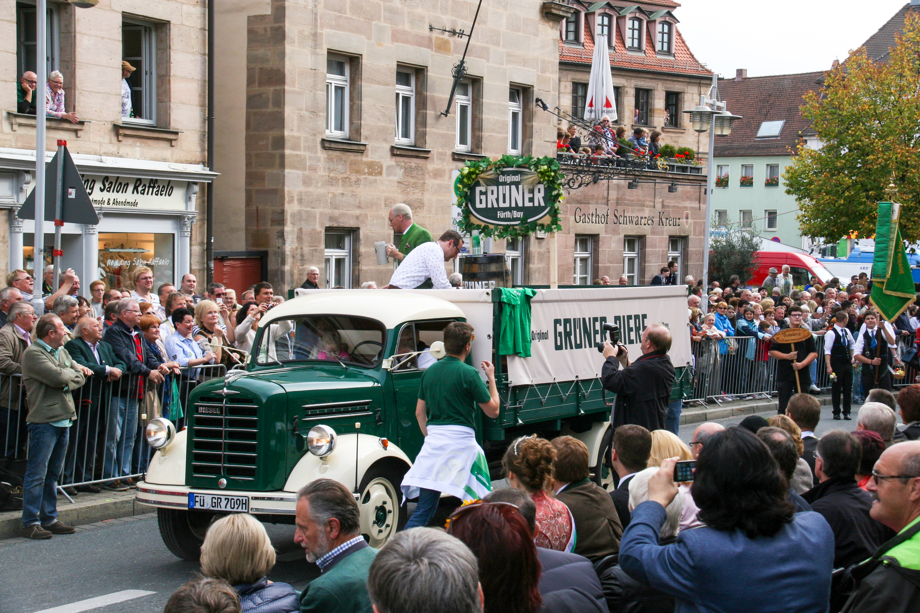 | Beschreibung | Volker Heißmann und Martin Rassau für die Grüner Brauerei auf dem Erntedankfestzug Okt. 2014 | ||