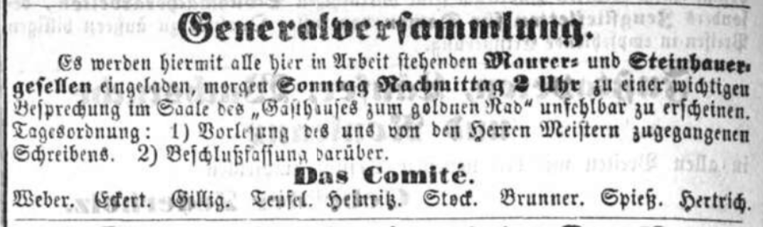 | Beschreibung | Anzeige des Fürther Maurergesellen-Komitees vom 23. Feb. 1872 | ||