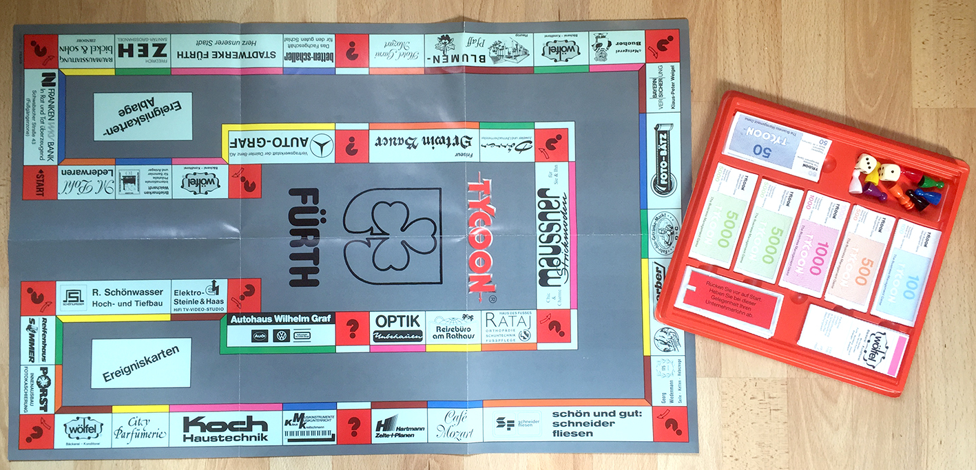 | Beschreibung | Tycoon (Monopoly), Fürth-Ausgabe aus dem Jahr 1986. Herausgegeben von den Stadtwerken | ||