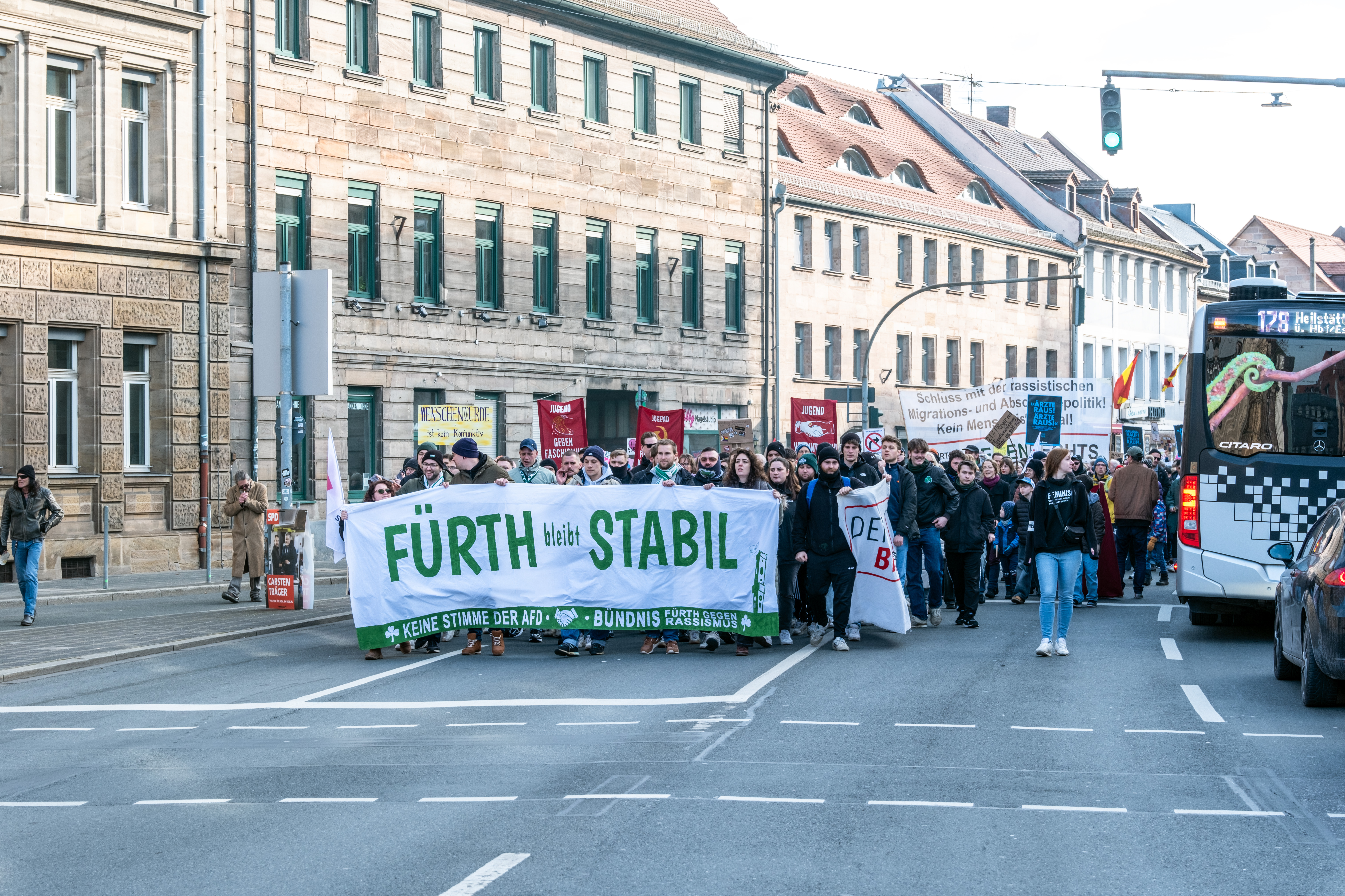 BeschreibungDemonstration Fürth bleibt stabil - 8. Februar 2025 - Demonstrationszug in der Königstraße auf dem zum Grünen Markt, Feb. 2025