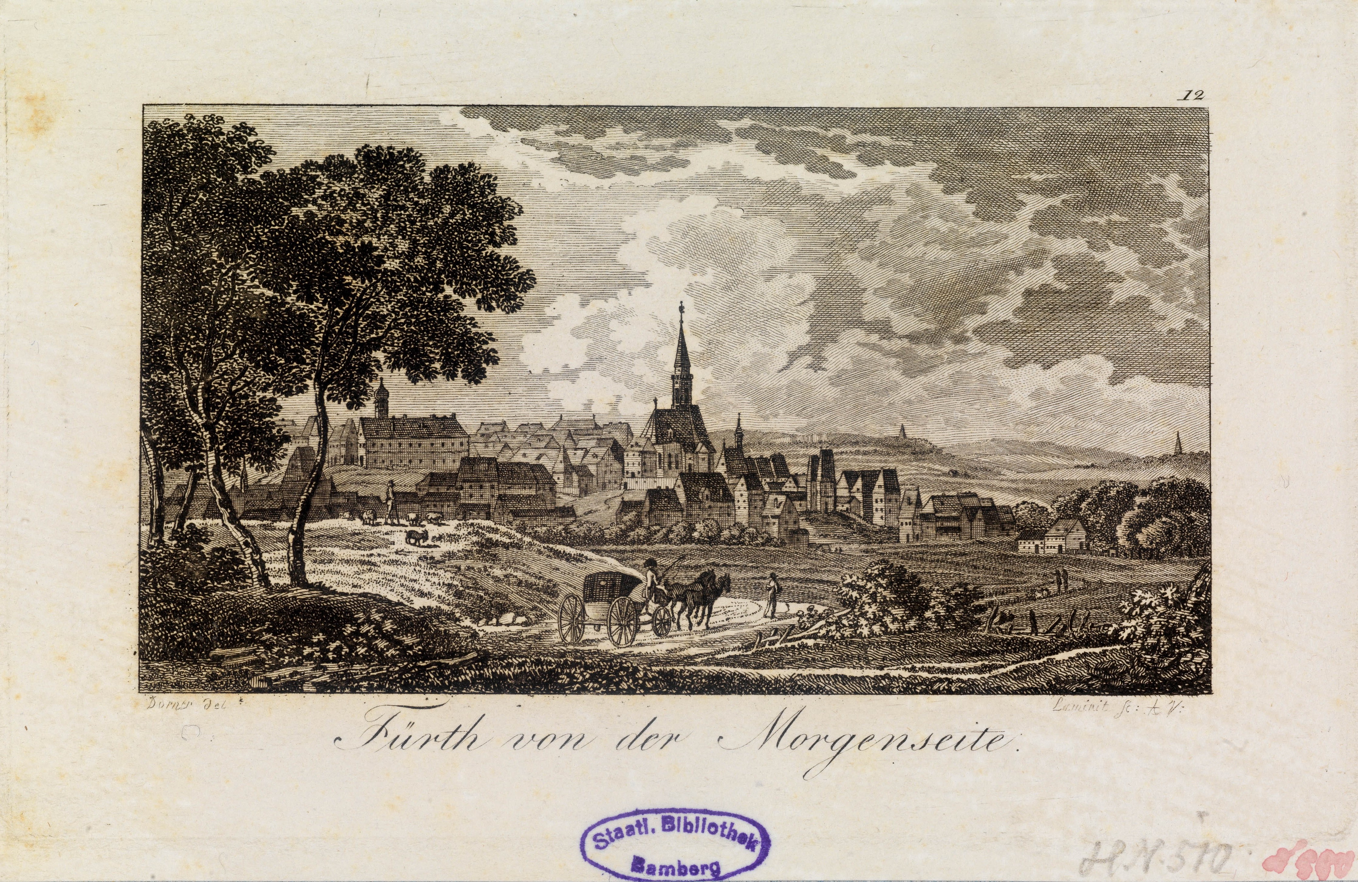 | Dateiinfo (Bild-Unterschrift und Info-Box, automatisch erstellt) | "Fürth von der Morgenseite". Kupferstich von Laminit nach Dorner, um 1810/1811 Urheber: Laminit, Dorner<br>Erstellungsdatum: 1810<br>Lizenz: cc-by-sa-4.0 | ||