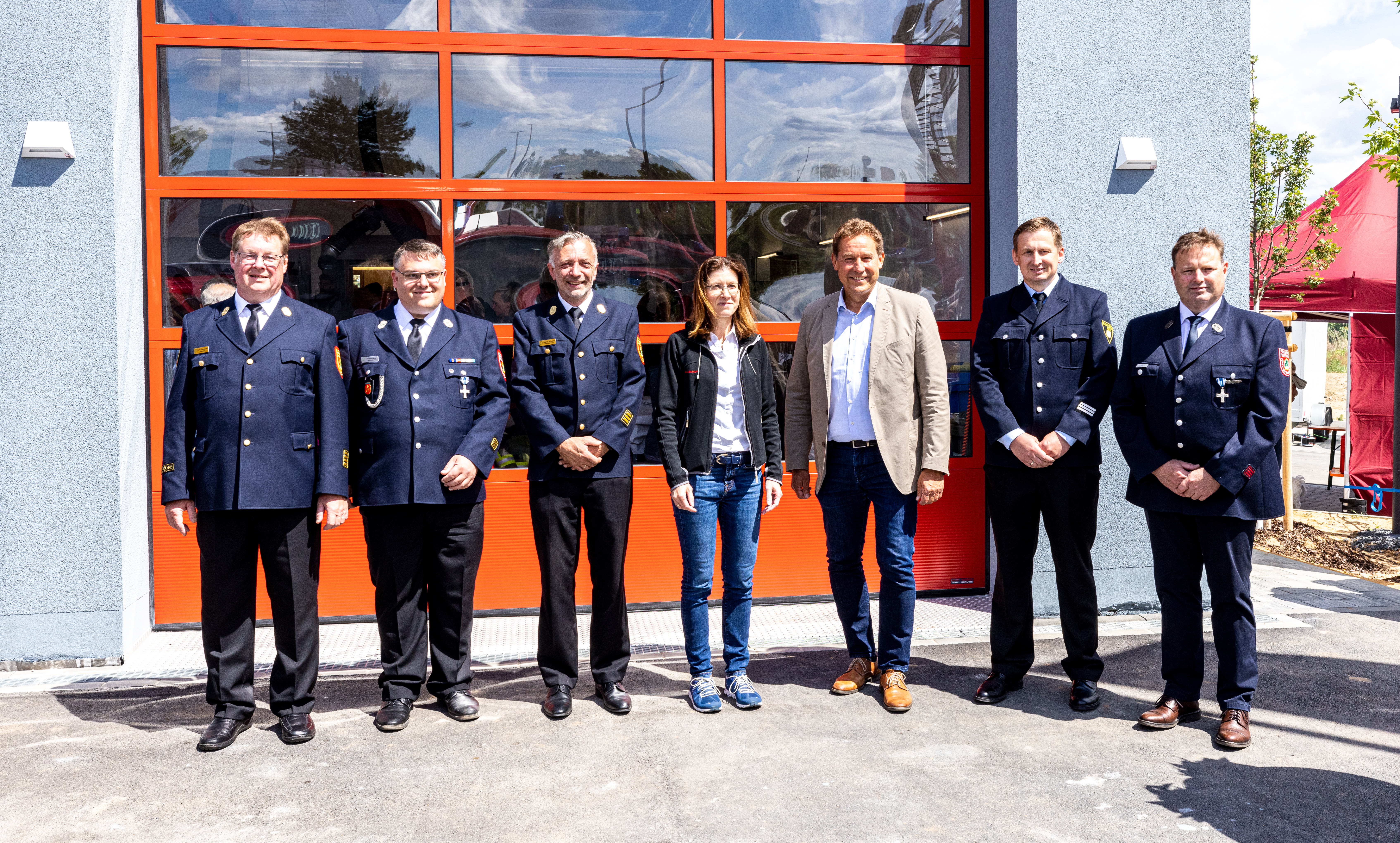 | Beschreibung | Feierliche Eröffnung des neuen Feuerwehrhauses der Freiwilligen Feuerwehr Unterfarrnbach, Im Bild v.l.n.re.: Gerd Auernheimer, Andreas Meyer, Stephan Scheuerer, Christine Lippert, BM Markus Braun, BM Dietmar Helm, Mai 2022 | ||