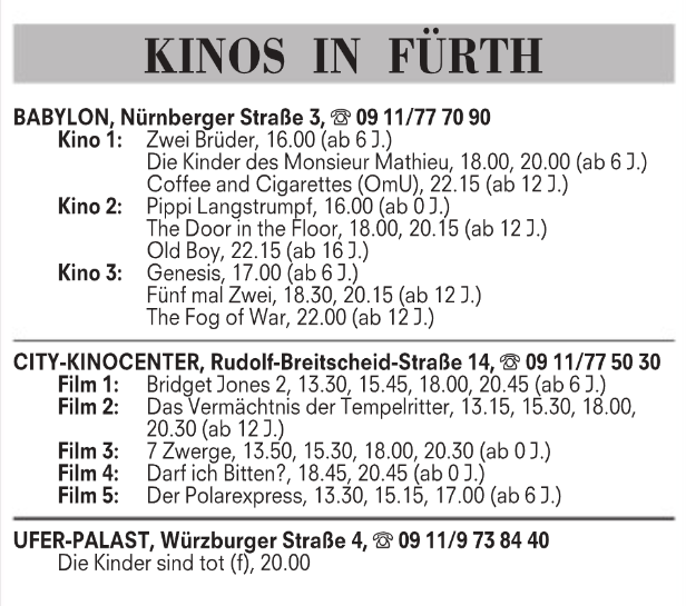 BeschreibungKinoanzeige in den Fürther Nachrichten vom 8. Dezember 2004 der noch vorhandenen Fürther Kinos