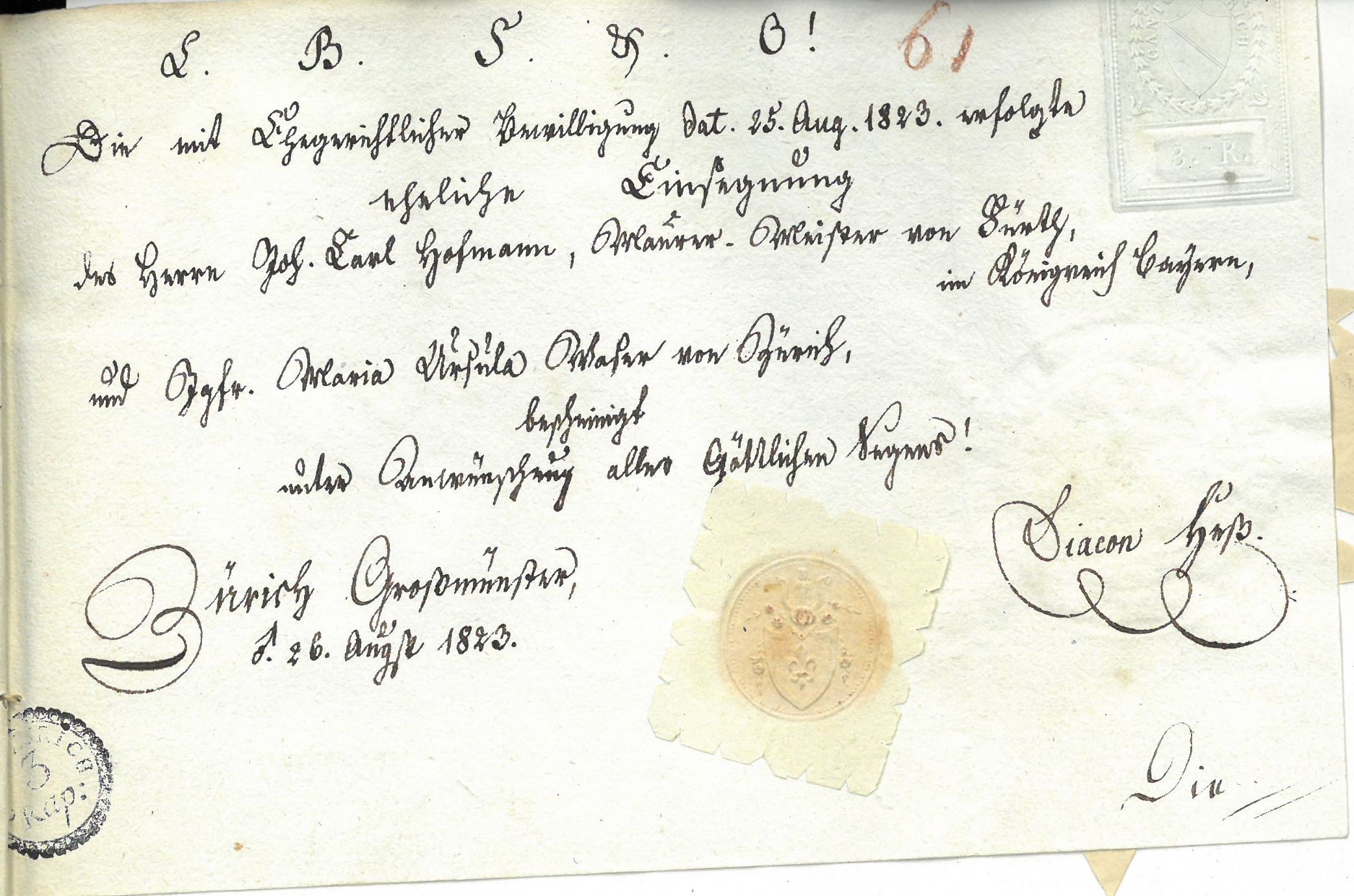 | Dateiinfo (Bild-Unterschrift und Info-Box, automatisch erstellt) | Trauschein des Großmünsters Zürich vom 26. Aug. 1823 Erstellungsdatum: 26. August 1823<br>Lizenz: Bildlizenz-Stadtarchiv | ||