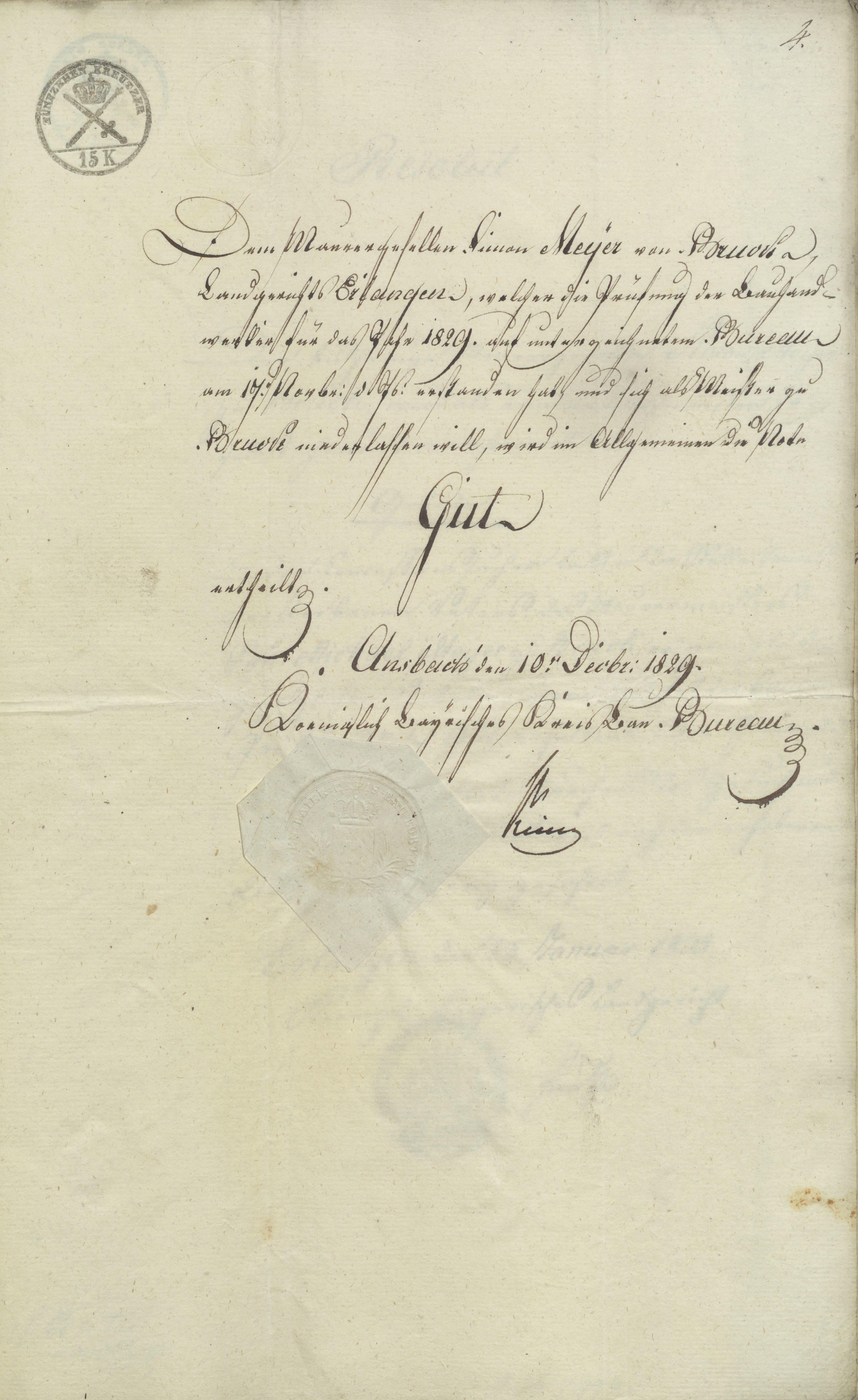 | Dateiinfo (Bild-Unterschrift und Info-Box, automatisch erstellt) | Prüfungszeugnis des Kreisbaubüros Ansbach vom 10. Dez. 1829 Erstellungsdatum: 10. Dezember 1829<br>Lizenz: Bildlizenz-Stadtarchiv | ||