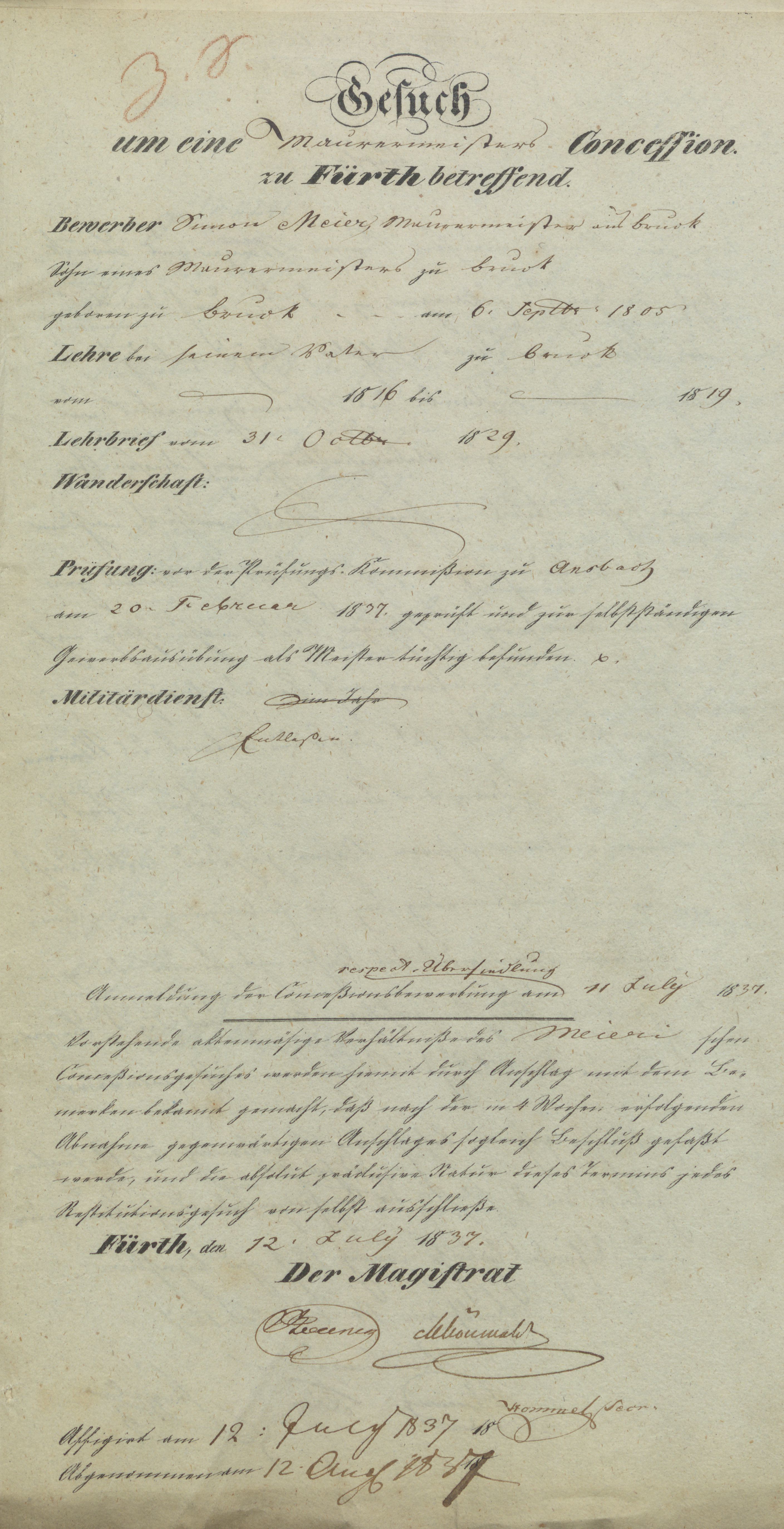 | Beschreibung | Bekanntmachung des Gesuchs um eine Maurermeister-Konzession vom 12. Juli 1837 | ||