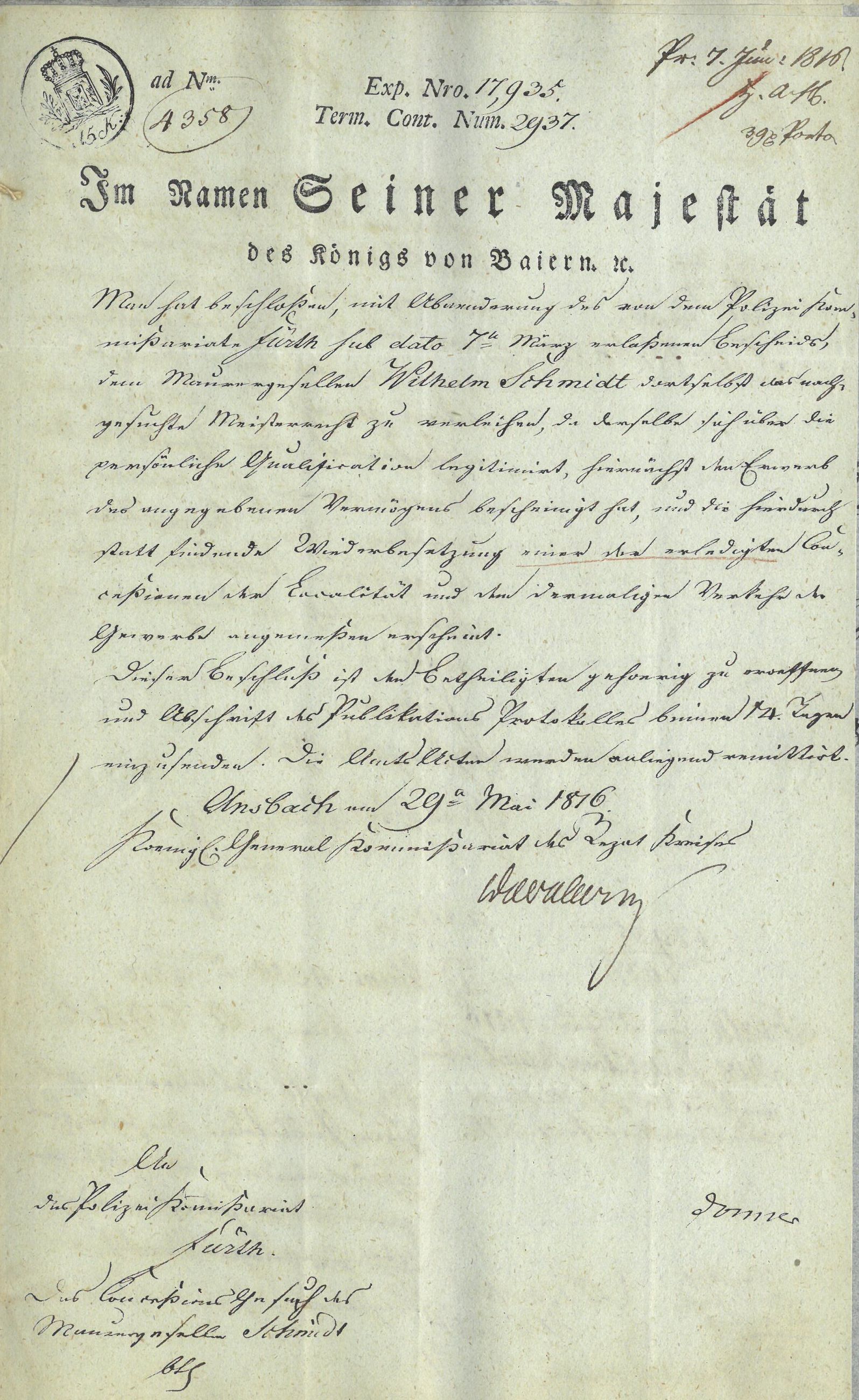| Beschreibung | Änderungsbeschluss des Kgl. Generalkommissariats des Rezatkreises vom 29. Mai 1816 zur Meisterrechtsverleihung für Wilhelm Schmidt | ||