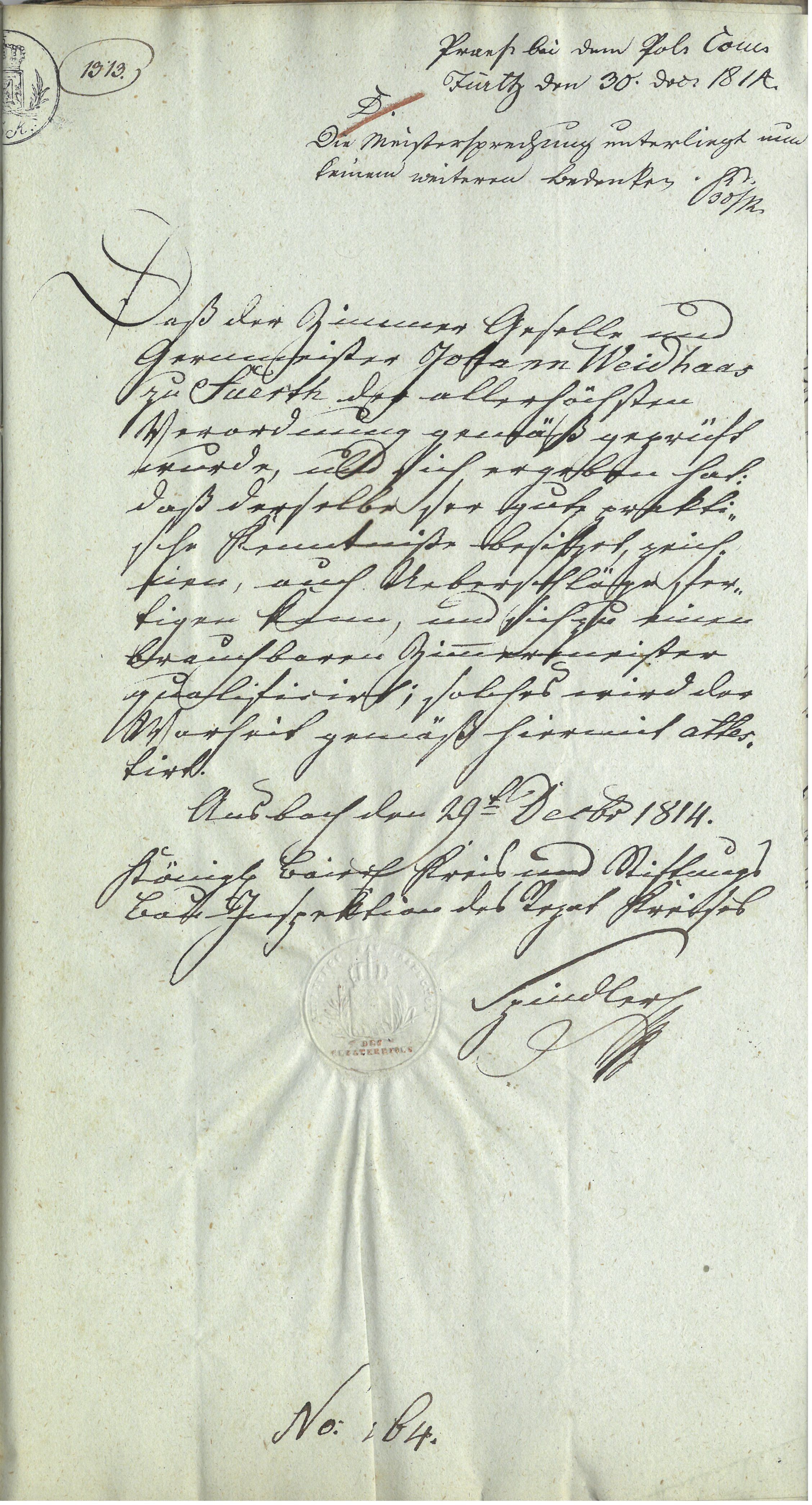 | Dateiinfo (Bild-Unterschrift und Info-Box, automatisch erstellt) | Prüfungszeugnis der K. B. Kreis- und Stiftungs-Bauinspektion des Rezatkreises für Johann Weithaas Erstellungsdatum: 29. Dezember 1814<br>Lizenz: Bildlizenz-Stadtarchiv | ||