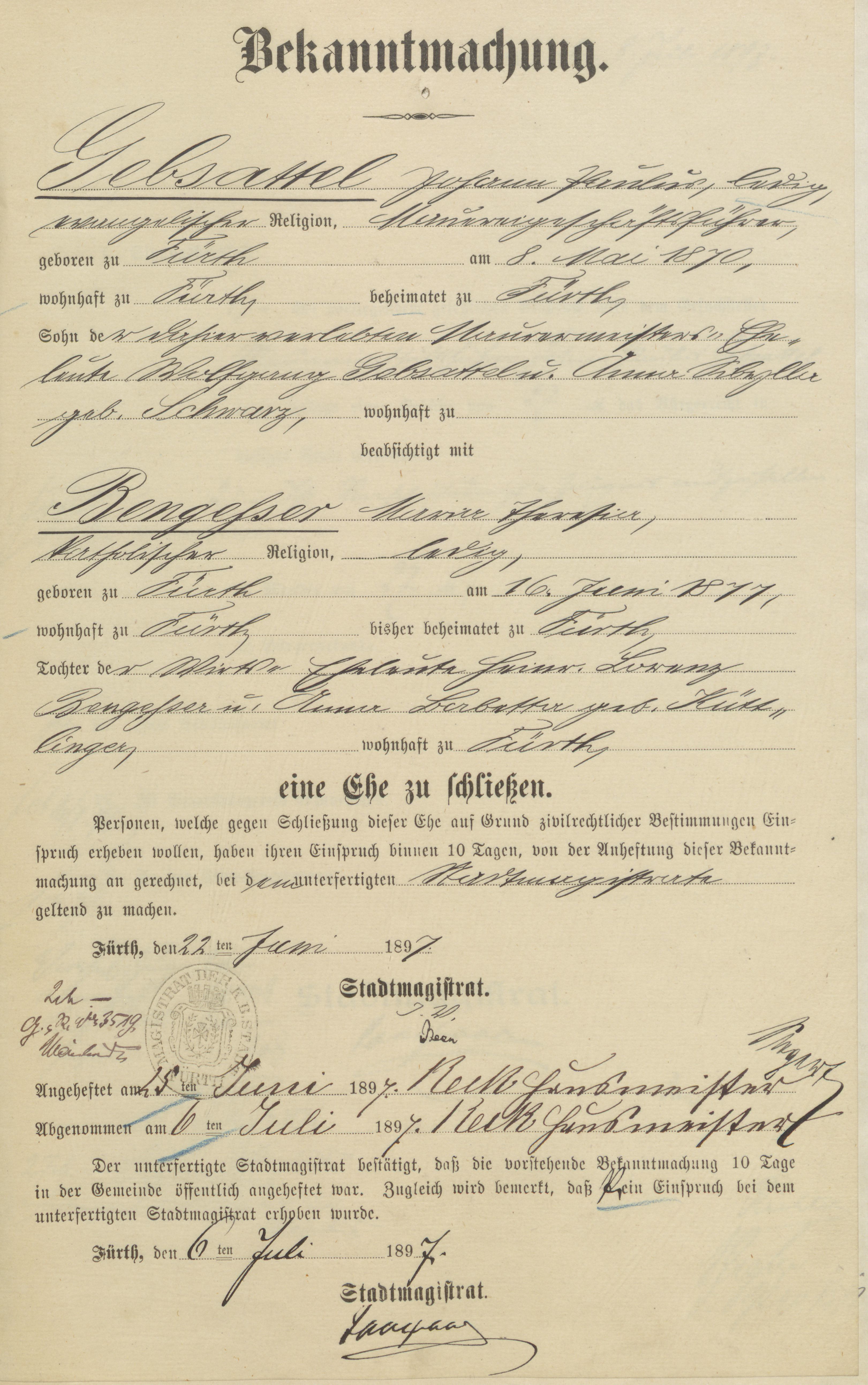 | Dateiinfo (Bild-Unterschrift und Info-Box, automatisch erstellt) | Bekanntmachung zur Eheschließung Gebsattel/Bengesser, Juni 1897 Erstellungsdatum: 22. Juni 1897<br>Lizenz: Bildlizenz-Stadtarchiv | ||