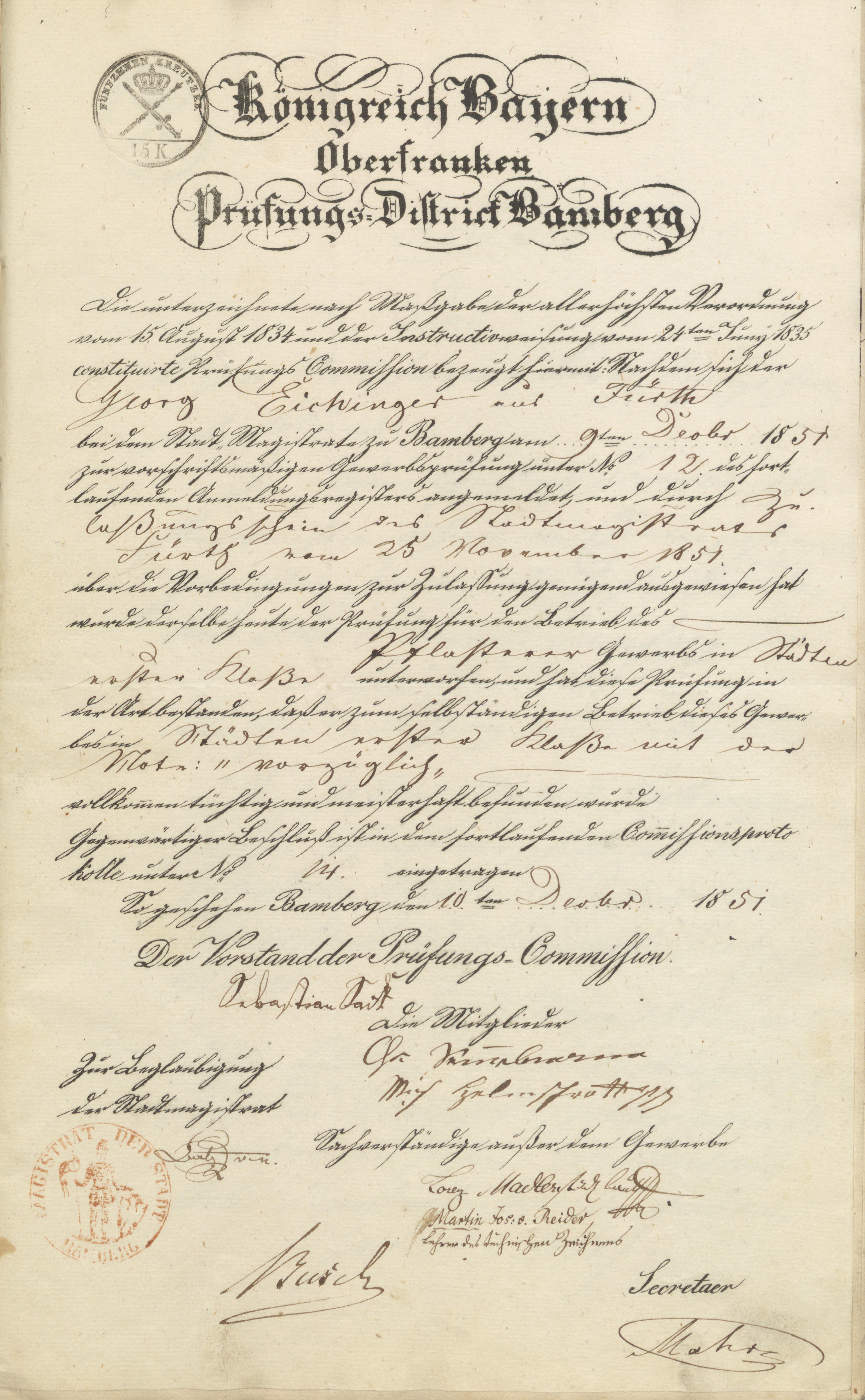 | Dateiinfo (Bild-Unterschrift und Info-Box, automatisch erstellt) | Prüfungszeugnis für Georg Eichinger, Dez. 1851 Erstellungsdatum: 10. Dezember 1851<br>Lizenz: Bildlizenz-Stadtarchiv | ||