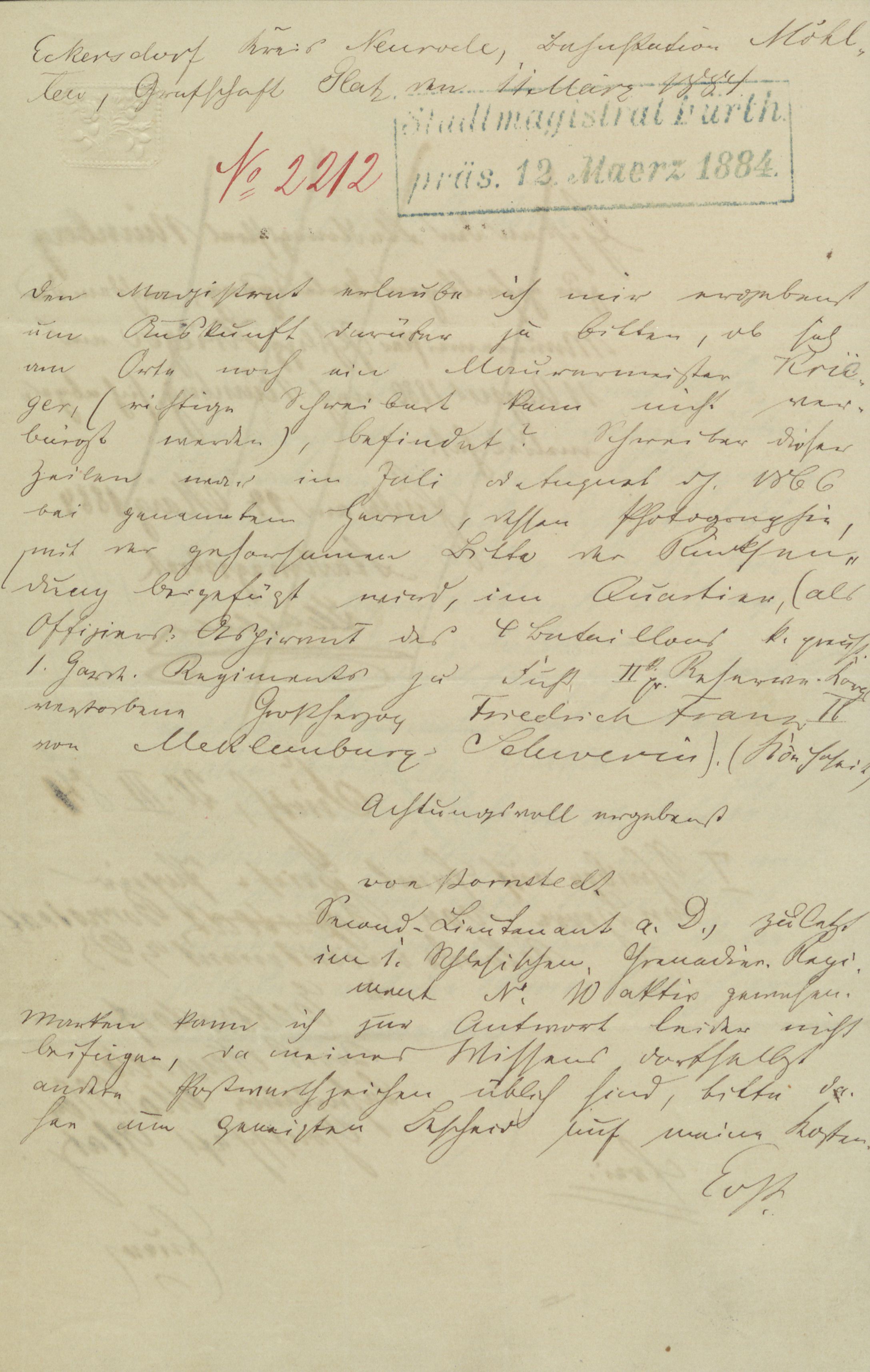 | Dateiinfo (Bild-Unterschrift und Info-Box, automatisch erstellt) | Erkundigung des Second-Lieutenant a. D. von Bornstedt nach Maurermeister Krieger, März 1884 Erstellungsdatum: 11. März 1884<br>Lizenz: Bildlizenz-Stadtarchiv | ||