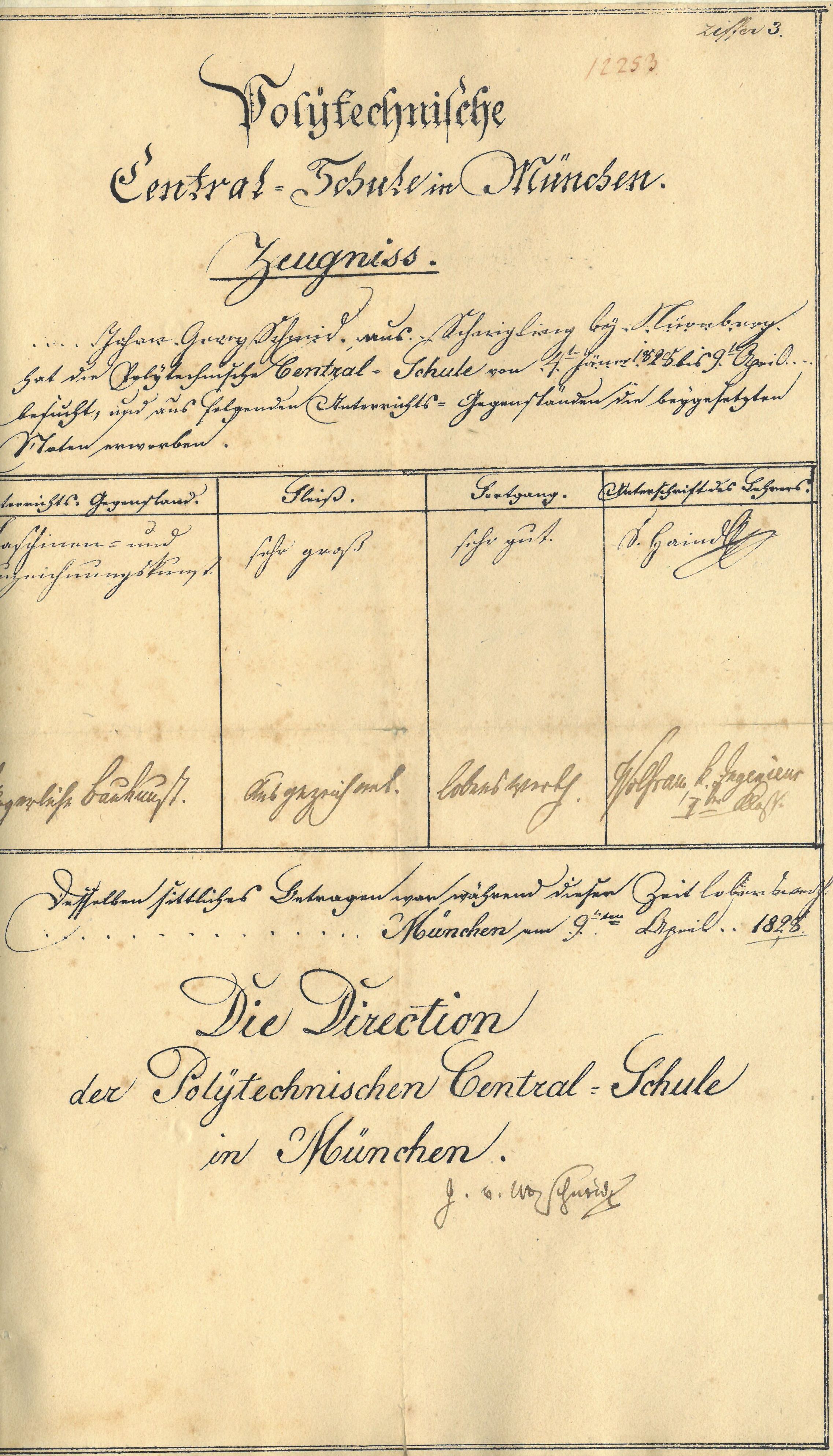 | Beschreibung | Zeugnis der Kgl. Polytechnischen Central-Schule München für Joh. Gg. Schmidt | ||