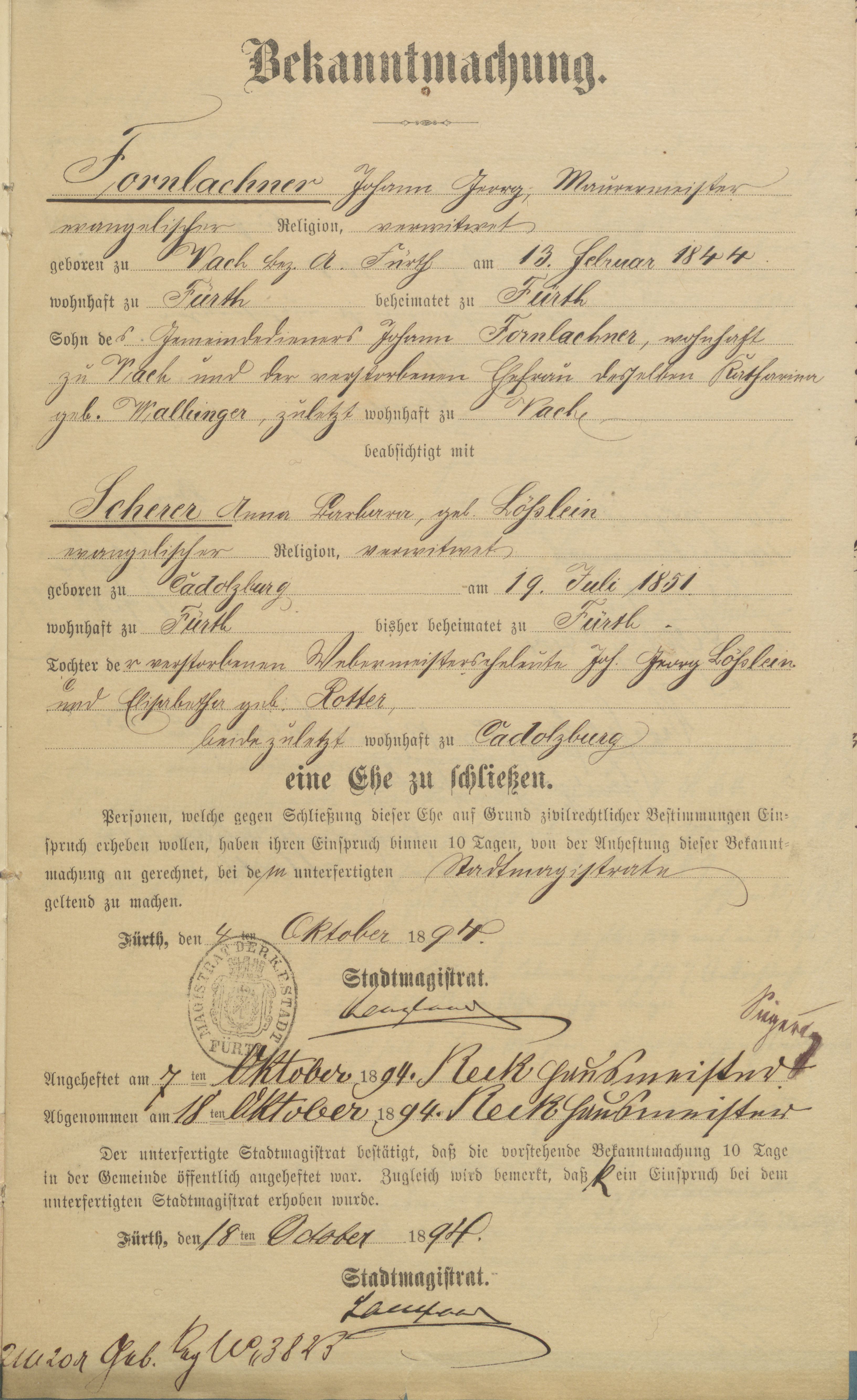 | Dateiinfo (Bild-Unterschrift und Info-Box, automatisch erstellt) | Bekanntmachung zur Eheschließung Fornlachner/Lösslein, Oktober 1894 Erstellungsdatum: 4. Oktober 1894<br>Lizenz: Bildlizenz-Stadtarchiv | ||