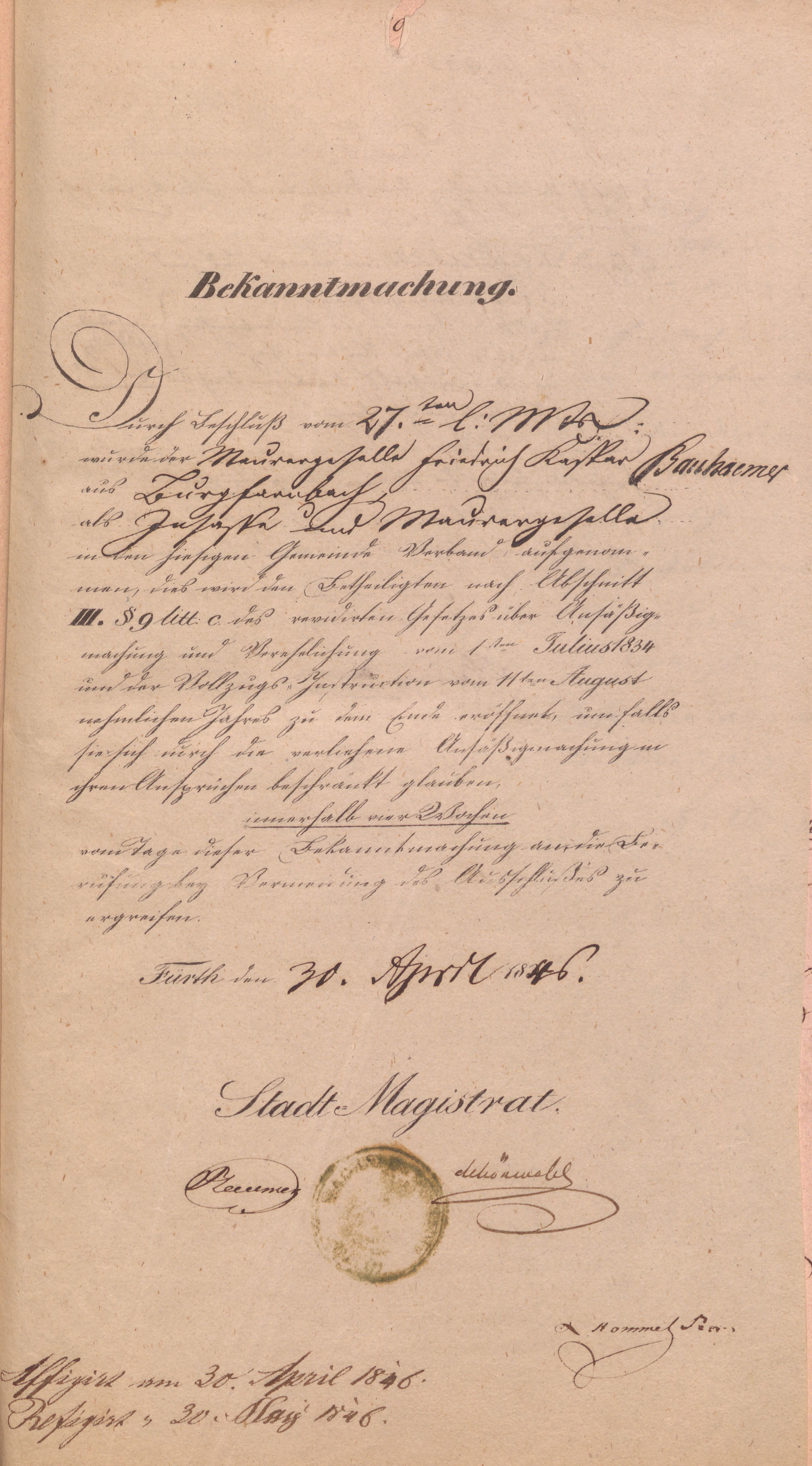 | Beschreibung | Bekanntmachung zur Aufnahme von Kaspar Friedrich Bau(m)hemmer vom 30. April 1846 | ||
