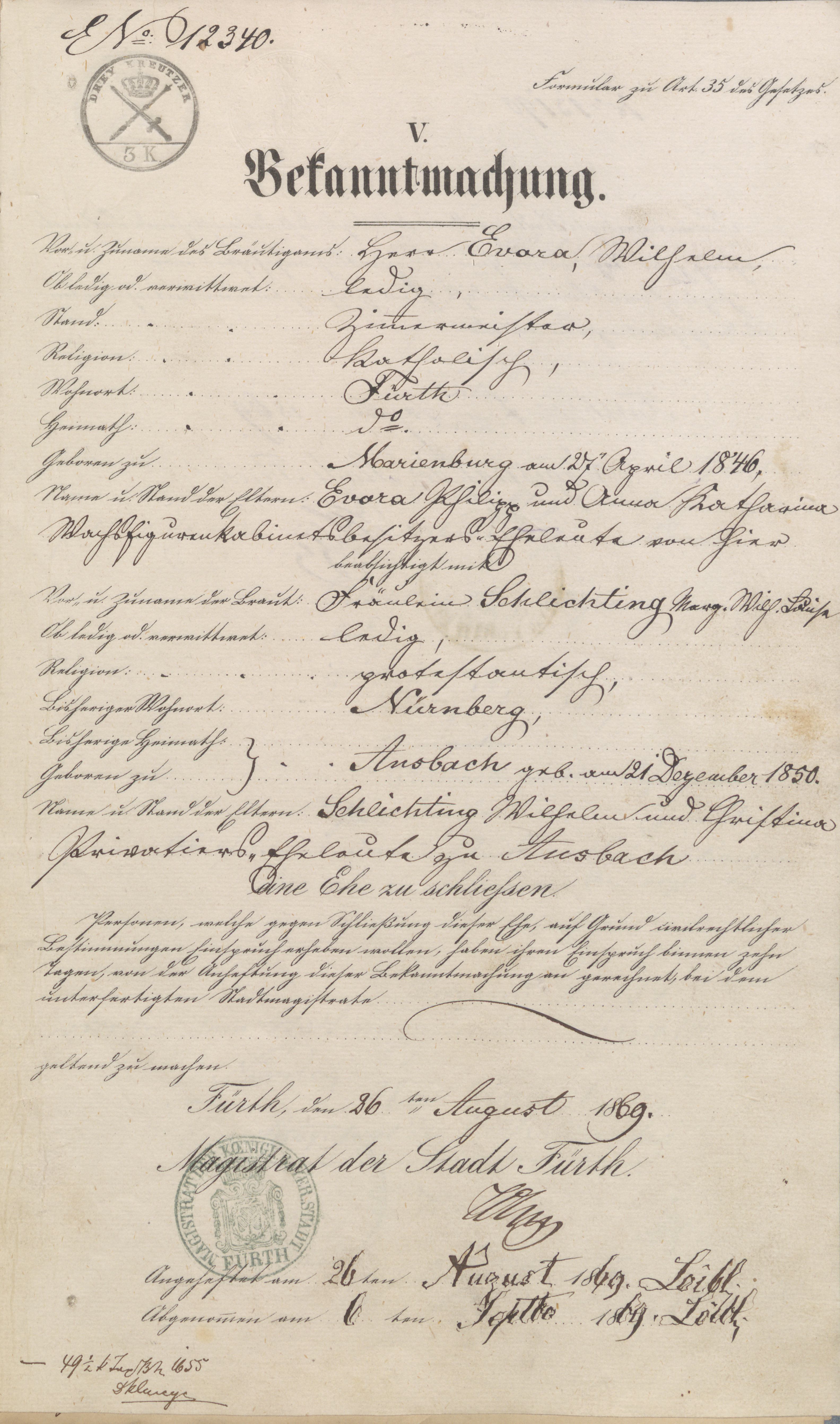 Bekanntmachung über Eheschließung Evora/Schlichting, August 1869 Erstellungsdatum: 26. August 1869<br>Lizenz: Bildlizenz-Stadtarchiv