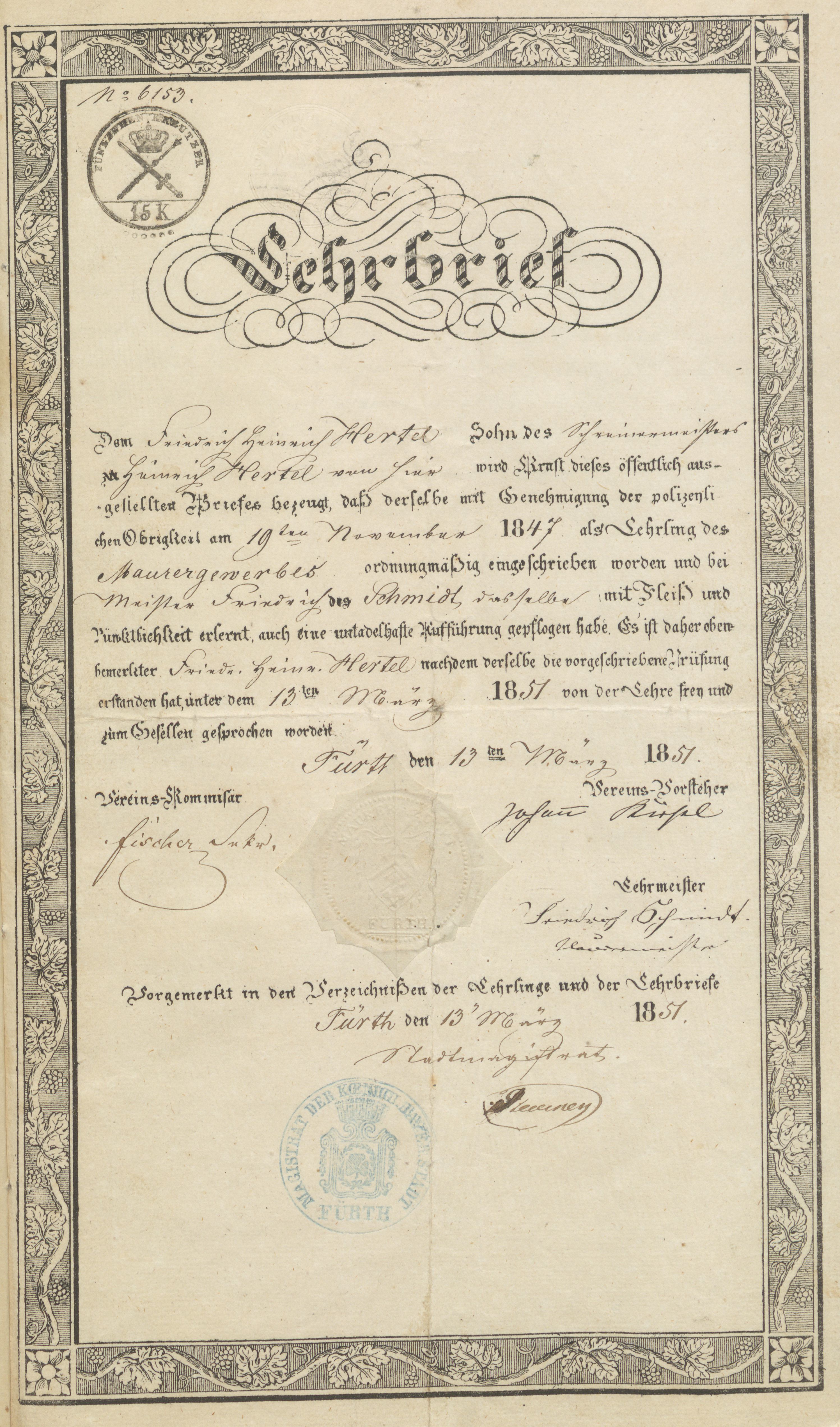 | Beschreibung | Lehrbrief für Friedrich Hertel vom 13. März 1851 | ||