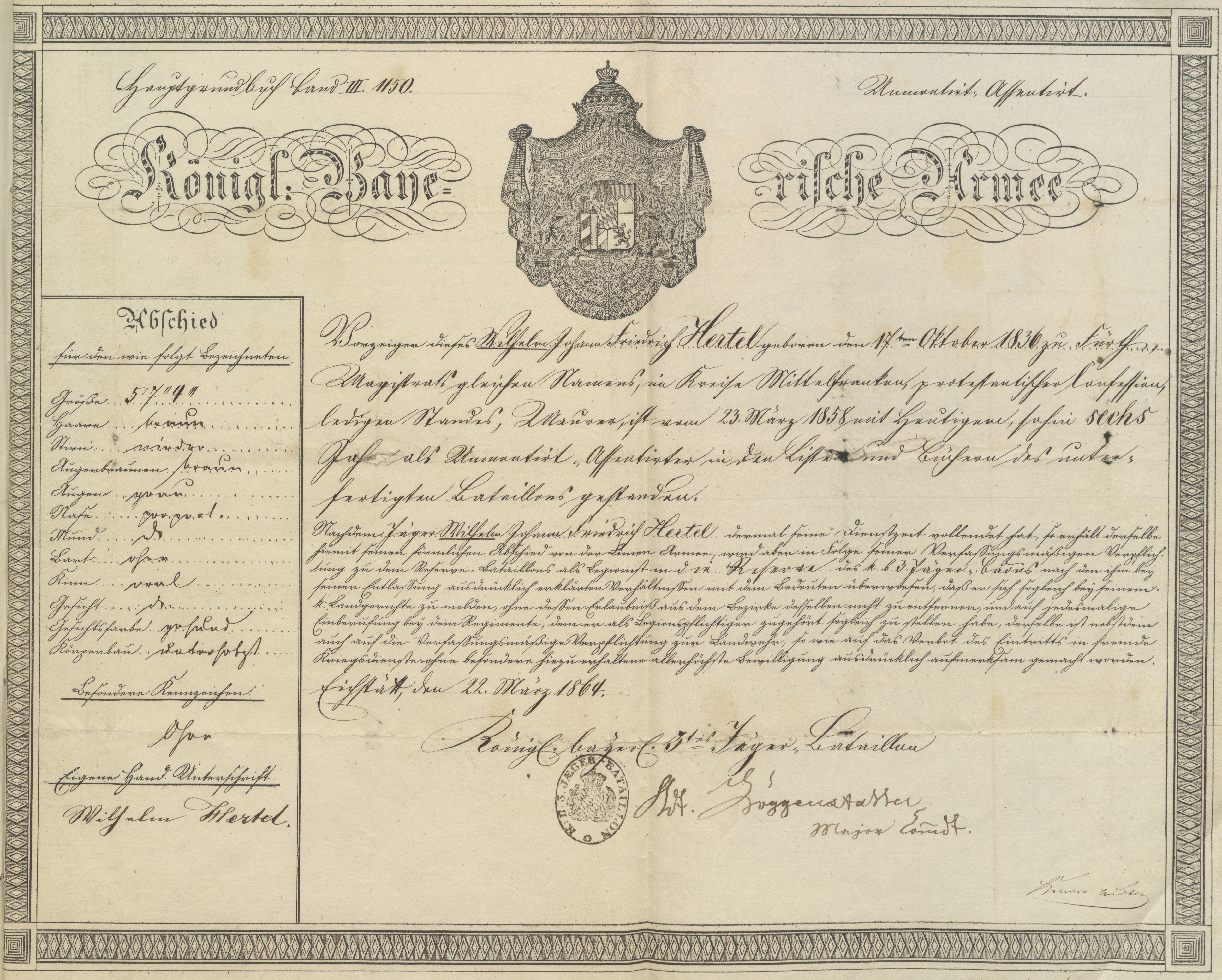 | Beschreibung | Militärabschiedsschein für Wilhelm Hertel, März 1864 | ||