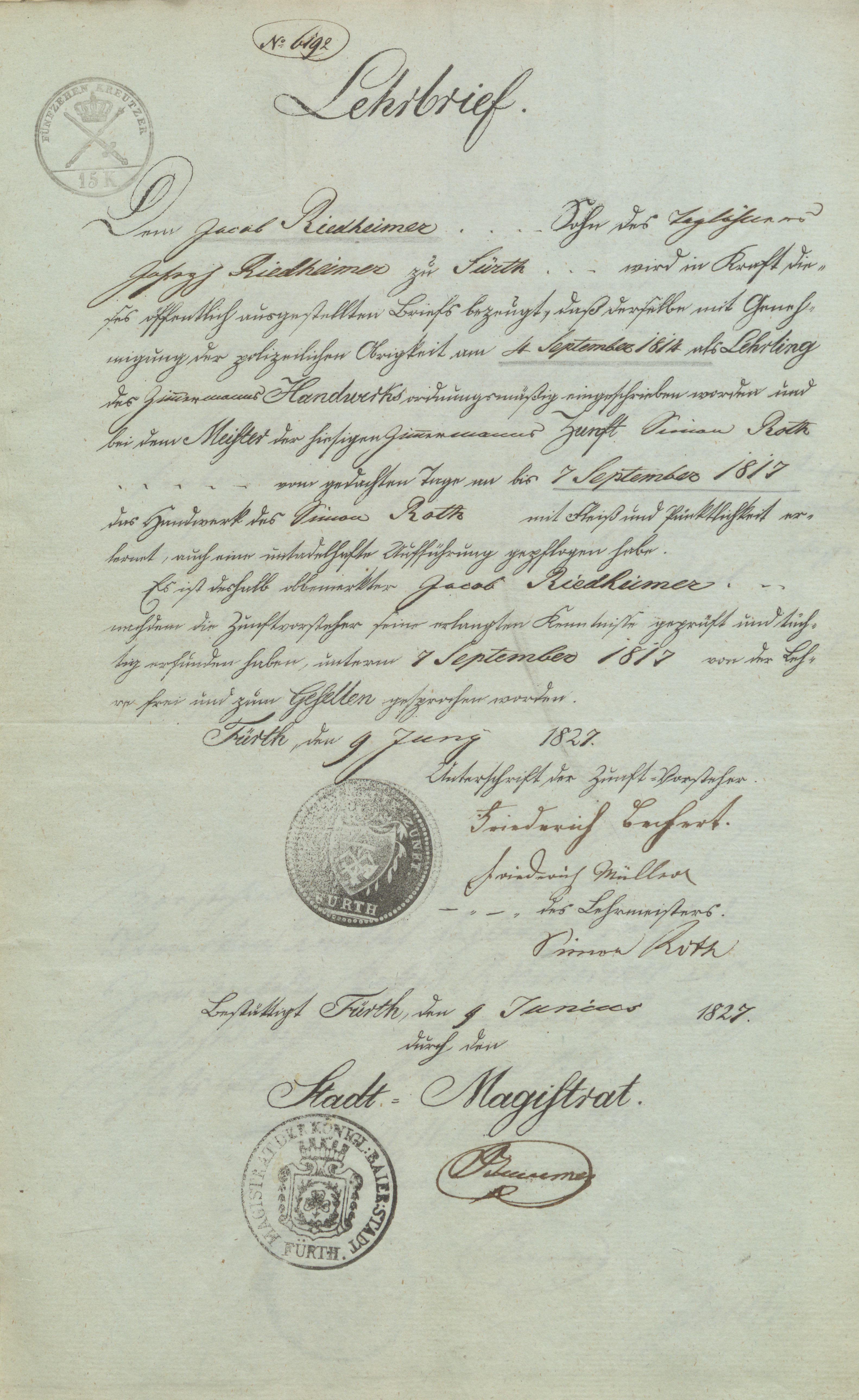 | Dateiinfo (Bild-Unterschrift und Info-Box, automatisch erstellt) | Lehrbrief für Jacob Riedheimer, nachträglich 1827 ausgestellt Lizenz: Bildlizenz-Stadtarchiv | ||