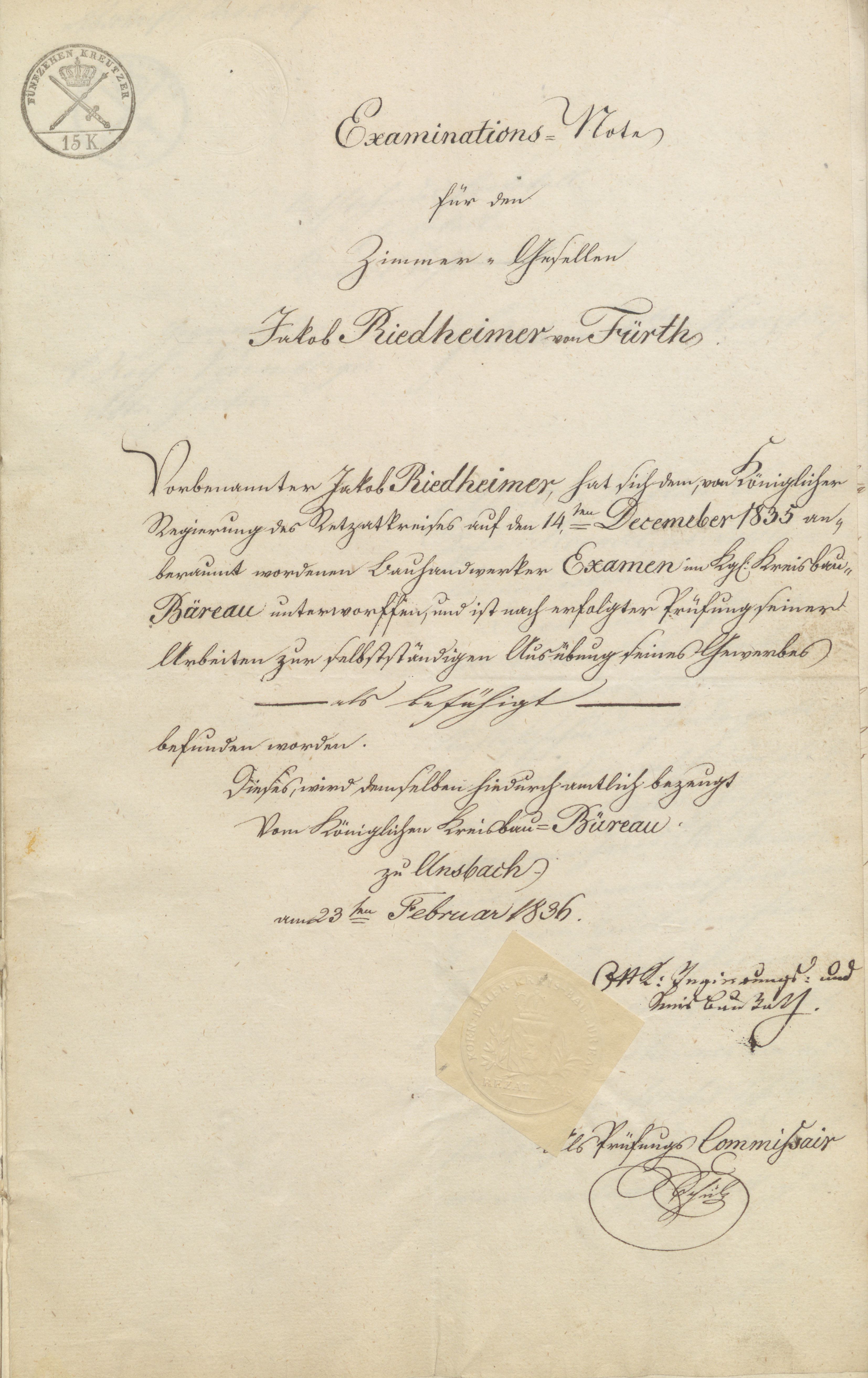 | Beschreibung | Prüfungszeugnis des Kgl. Kreisbaubüros zu Ansbach vom 23. Februar 1836 | ||