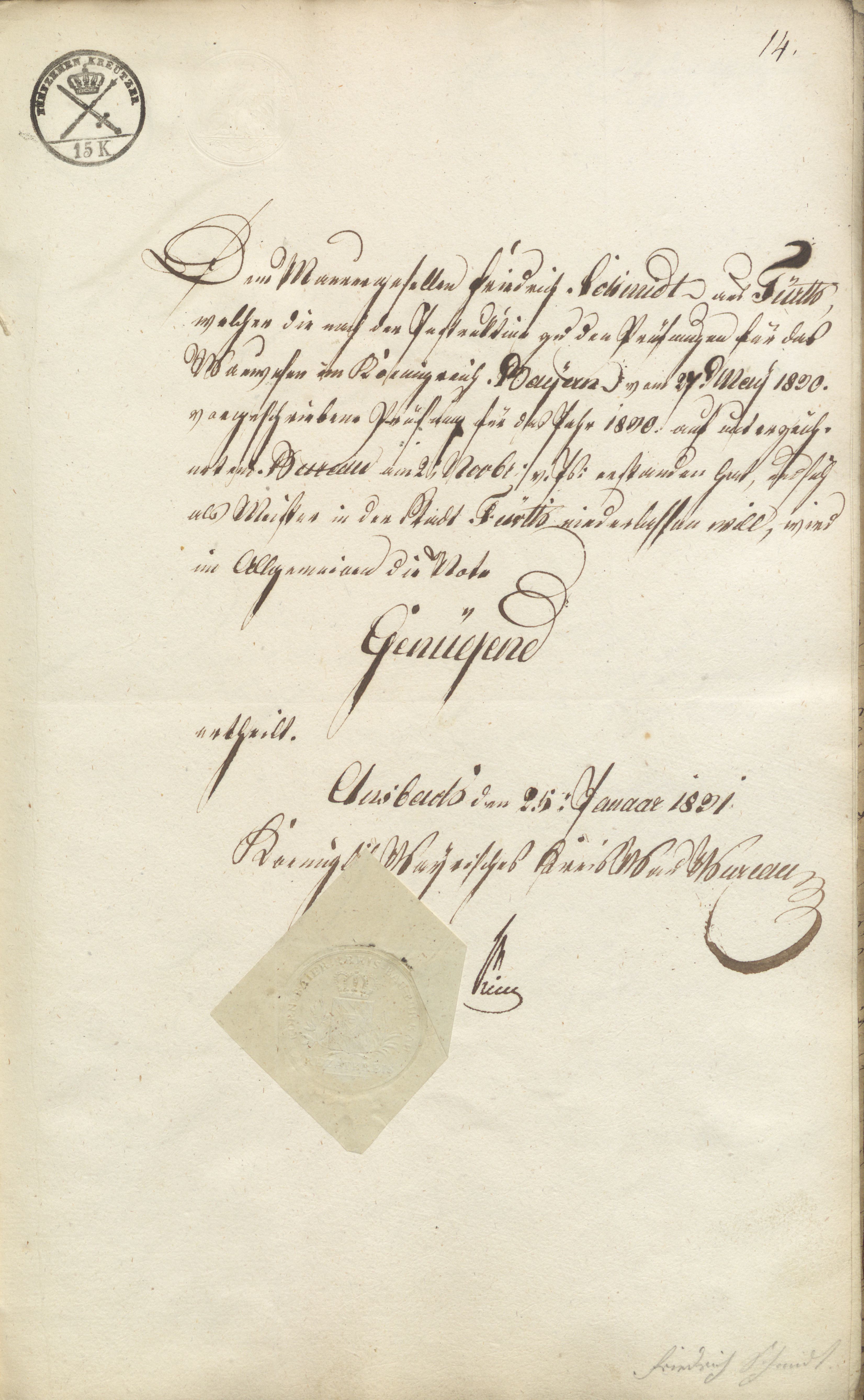 | Dateiinfo (Bild-Unterschrift und Info-Box, automatisch erstellt) | Prüfungszeugnis des königl. bay. Kreisbaubüros Ansbach für Friedrich Schmidt vom Januar 1831 Erstellungsdatum: 25. Januar 1831<br>Lizenz: Bildlizenz-Stadtarchiv | ||