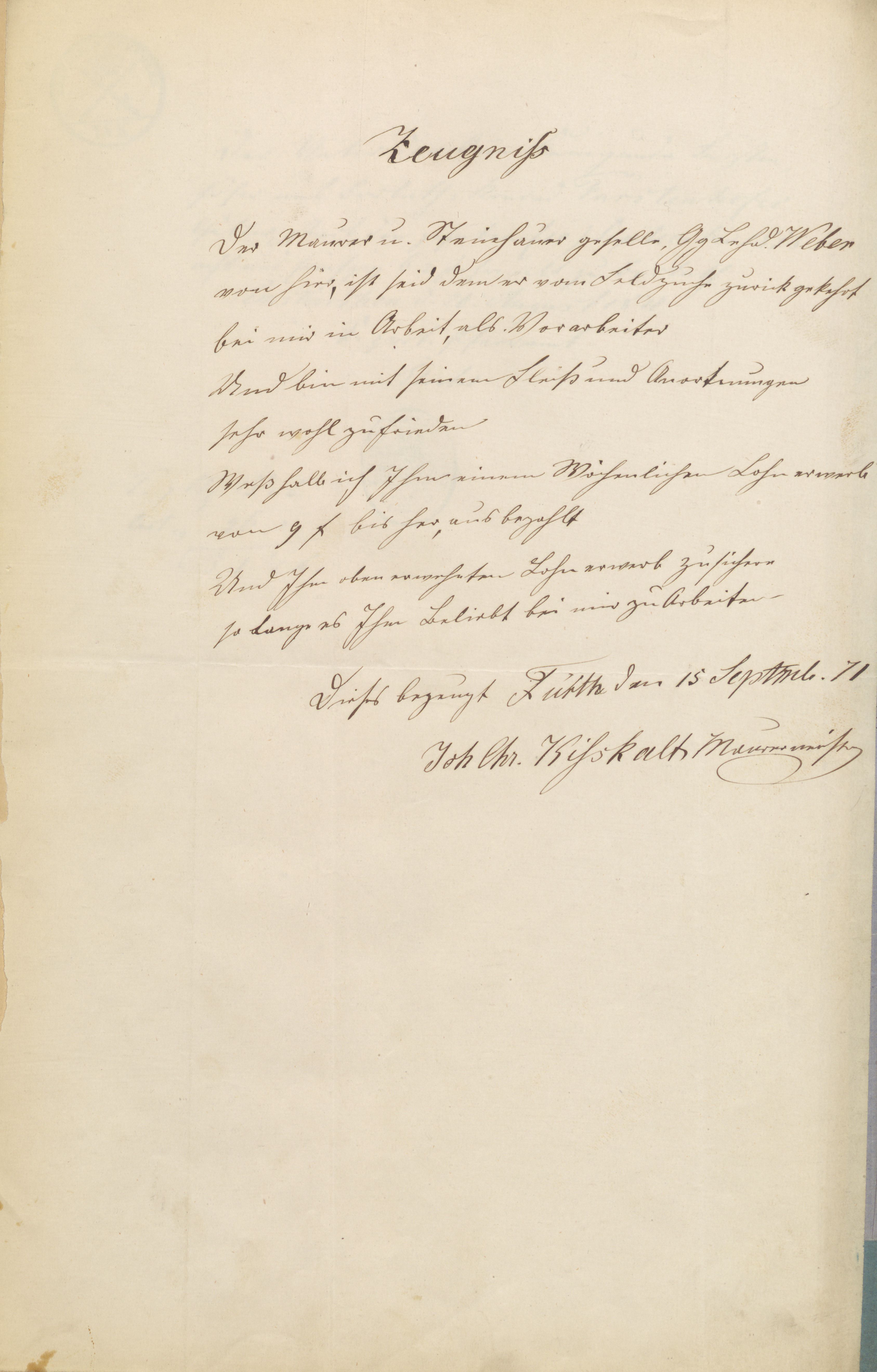 | Beschreibung | Arbeitszeugnis für Leonhard Weber, ausgestellt von Maurermeister Joh. Chr. Kisskalt (1871) | ||