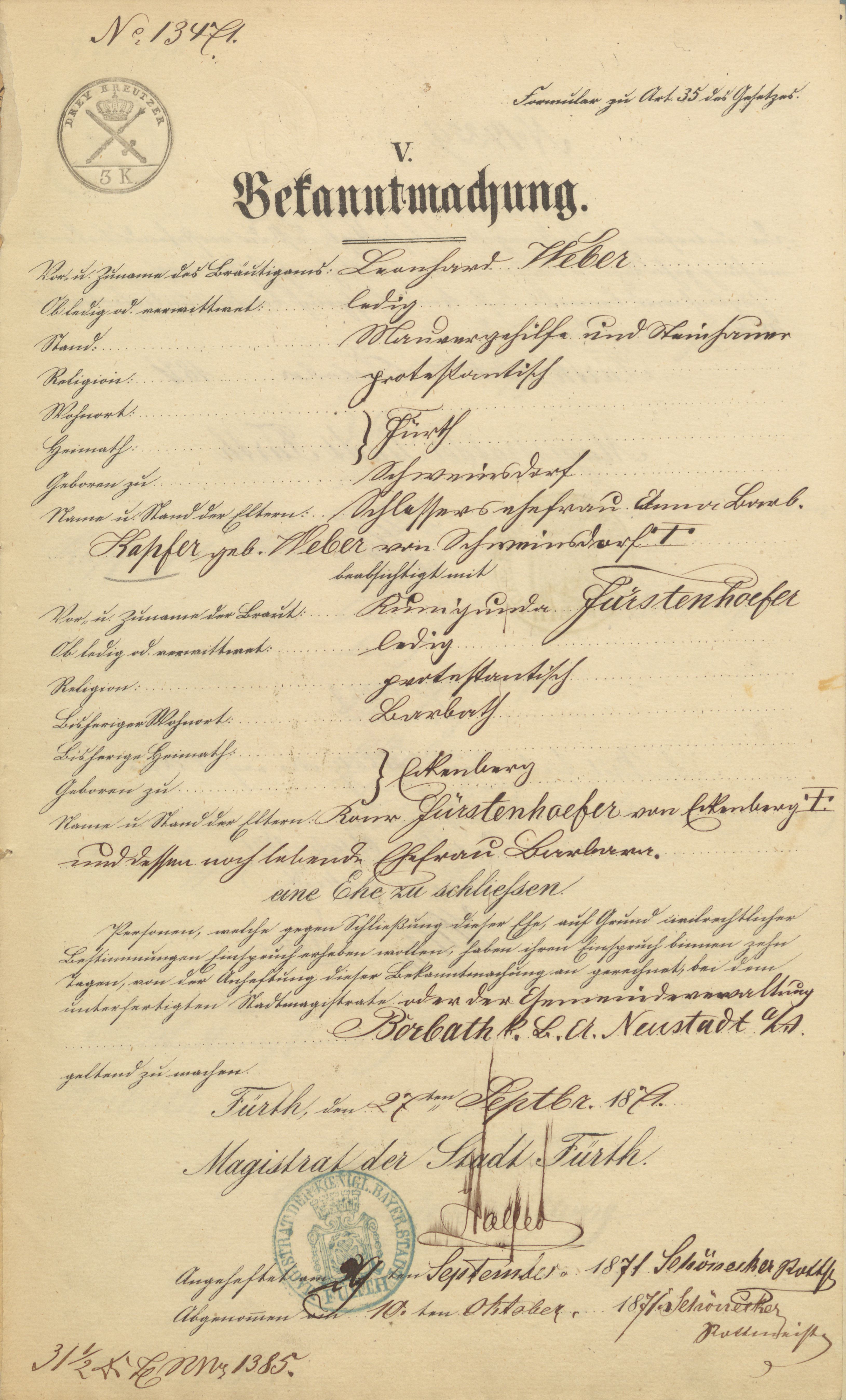 | Beschreibung | Bekanntmachung zur Verehelichungsabsicht Weber – Fürstenhöfer, Sept. 1871 (mit fehlerhaften Daten zur Person) | ||
