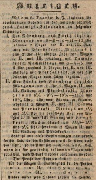 | Beschreibung | Fahrplan und Fahrpreise der Ludwigseisenbahn, Dezember 1835 | ||