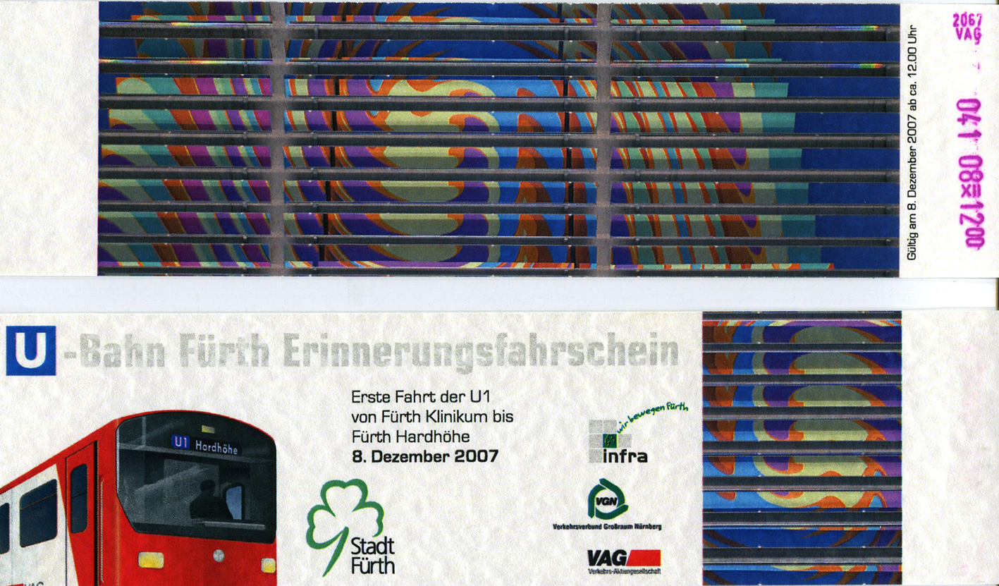 | Dateiinfo (Bild-Unterschrift und Info-Box, automatisch erstellt) | Fahrkarte für die erste Fahrt der U 1 zur neue U-Bahnhaltestelle Hardhöhe, Dez. 2007 Urheber: infra Fürth<br>Erstellungsdatum: 8. Dezember 2007<br>Über Datum: 8. Dezember 2007<br>Lizenz: cc-by-sa-3.0 | ||