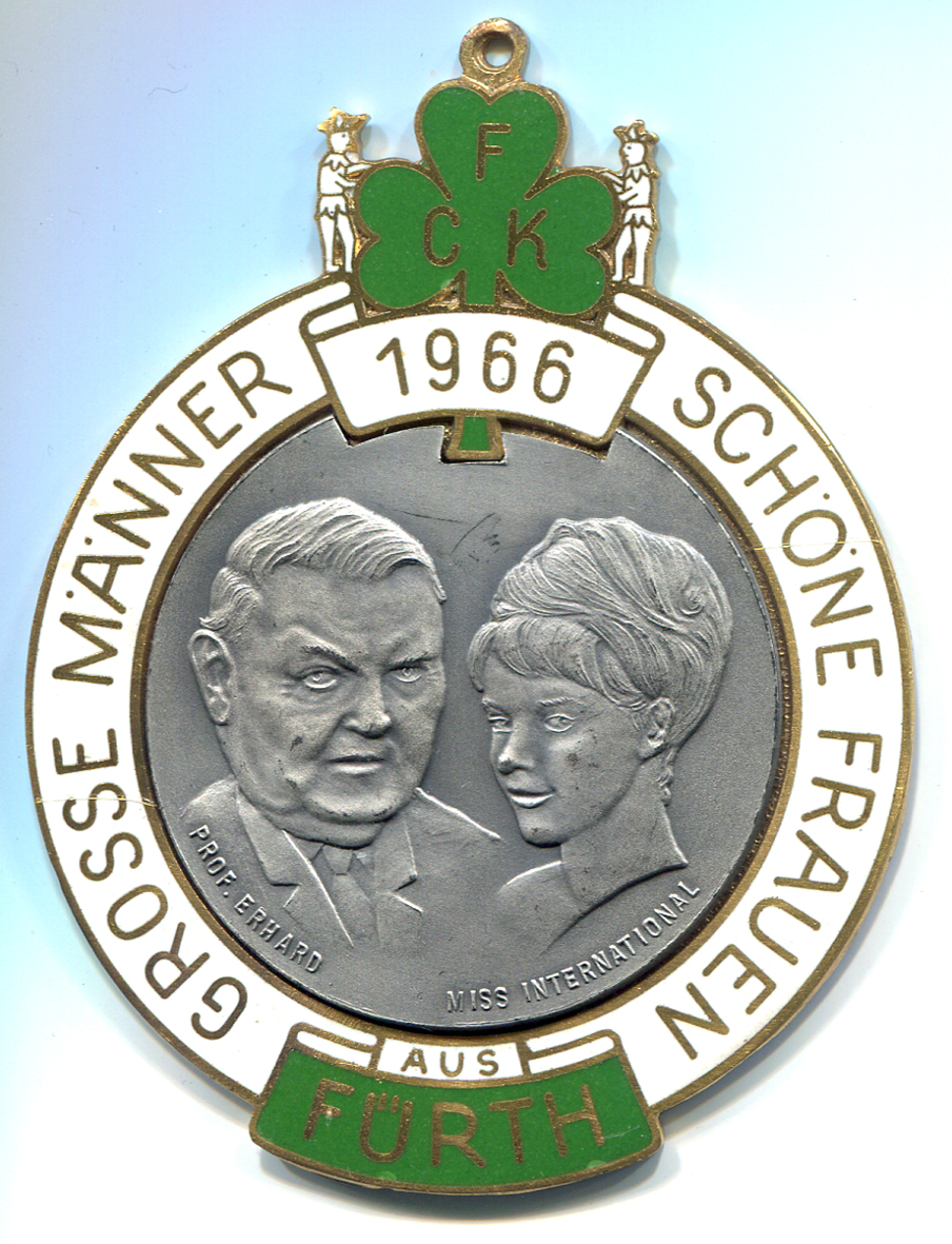 | Beschreibung | Sessionsorden der CFK, Saison 1966, Metall, Motiv Bundeskanzler Ludwig Erhard und Miss International 1965 Ingrid Finger | ||