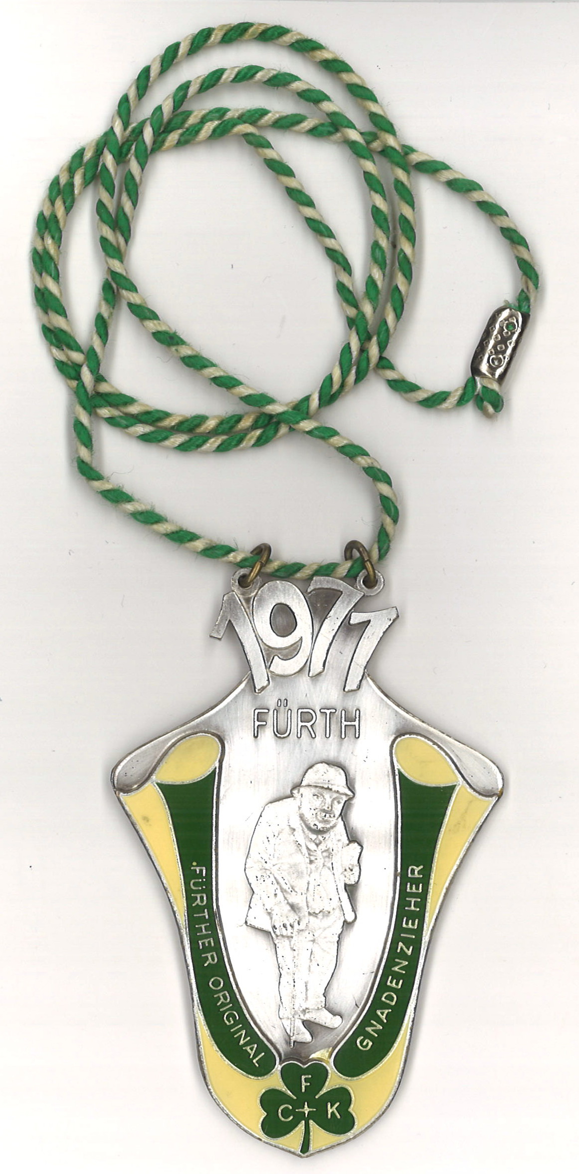 | Beschreibung | Sessionsorden der CFK, Saison 1971, Metall, Motiv „Fürther Original Gnadnsiea“ (hier Gnadenzieher geschrieben) | ||