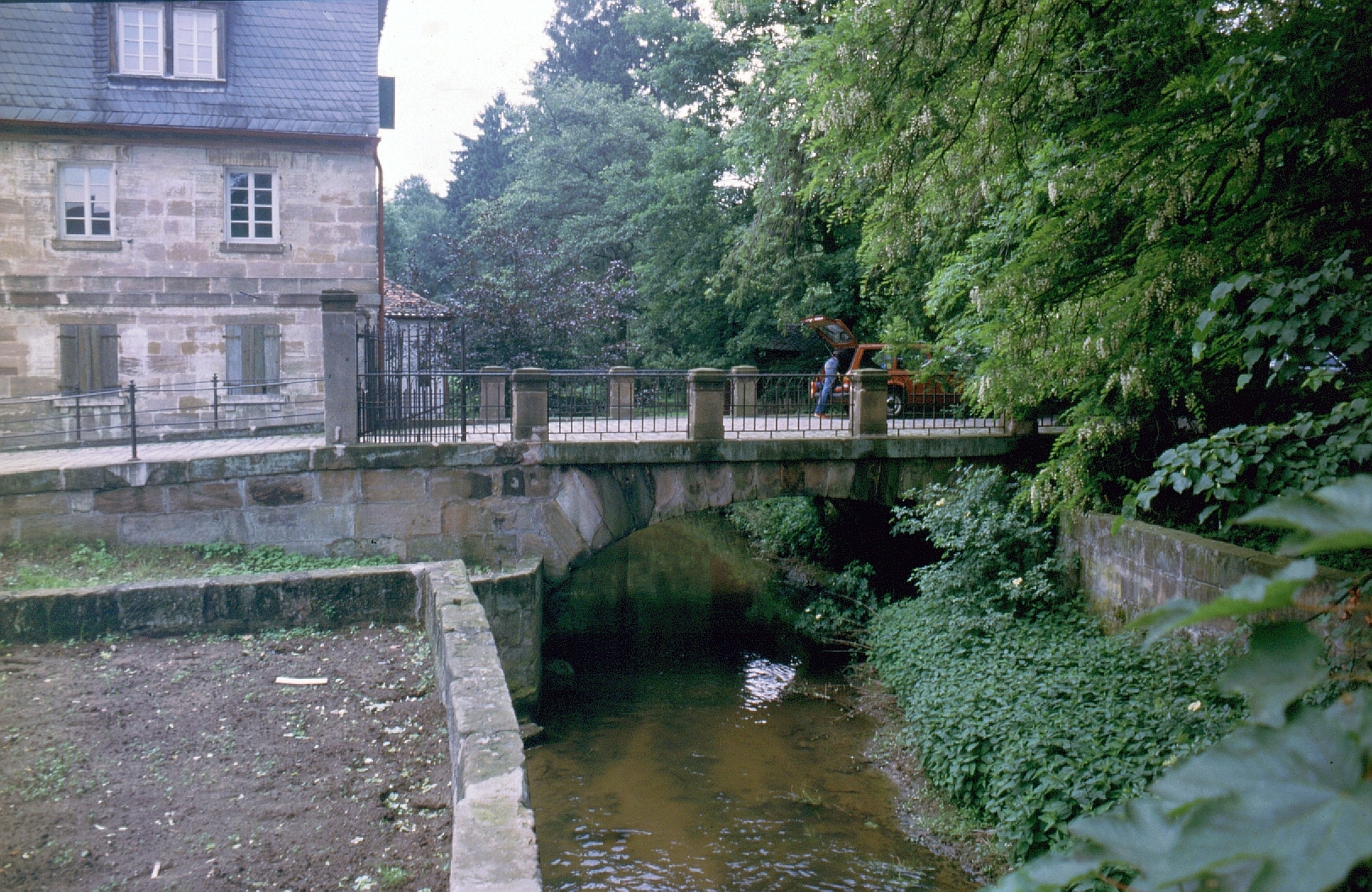 Brücke über die Farrnbach am Schloss Burgfarrnbach (Juni 1986) Urheber: Bernd Jesussek<br><br>Lizenz: CC BY-SA 4.0