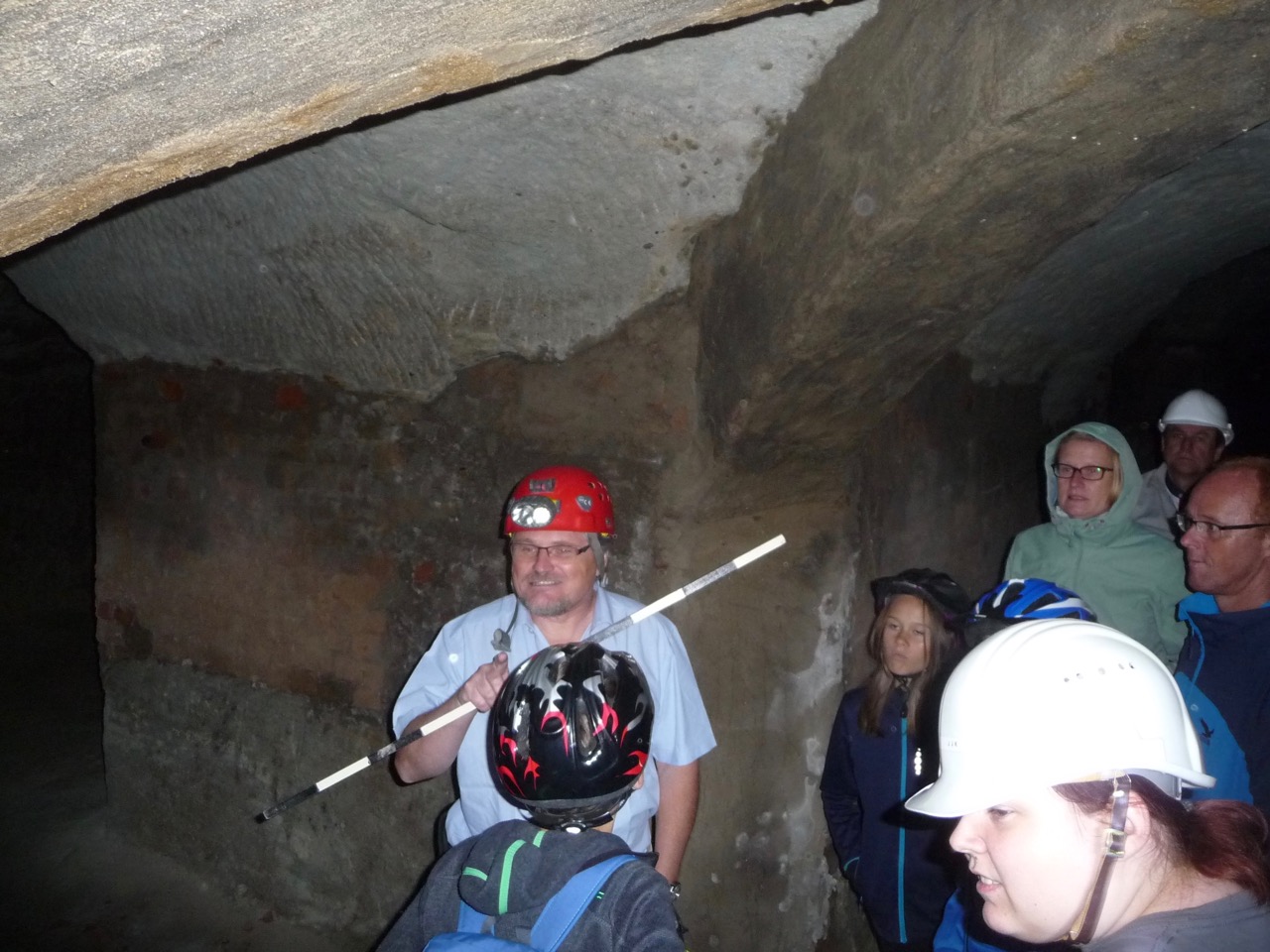 Der Beauftragte des Bayerischen Landesamtes für Denkmalpflege, Geologe Bernhard Häck, bei der Führung im unterirdischen Steinbruch Burgfarrnbach am Denkmaltag 11. September 2016