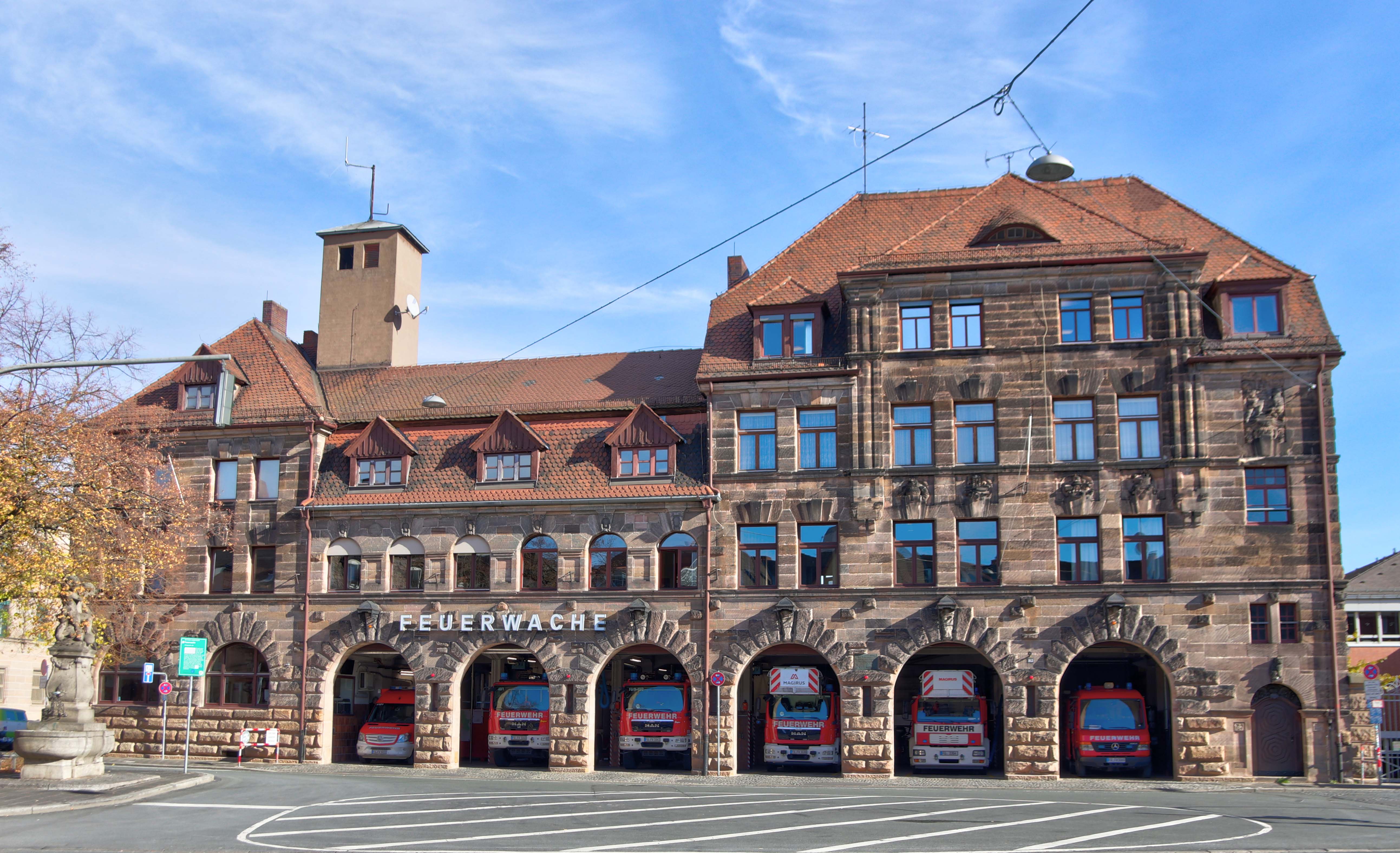 | Beschreibung | Feuerwache an der Königstraße mit geöffneten Toren und Einsatzfahrzeugen. | ||