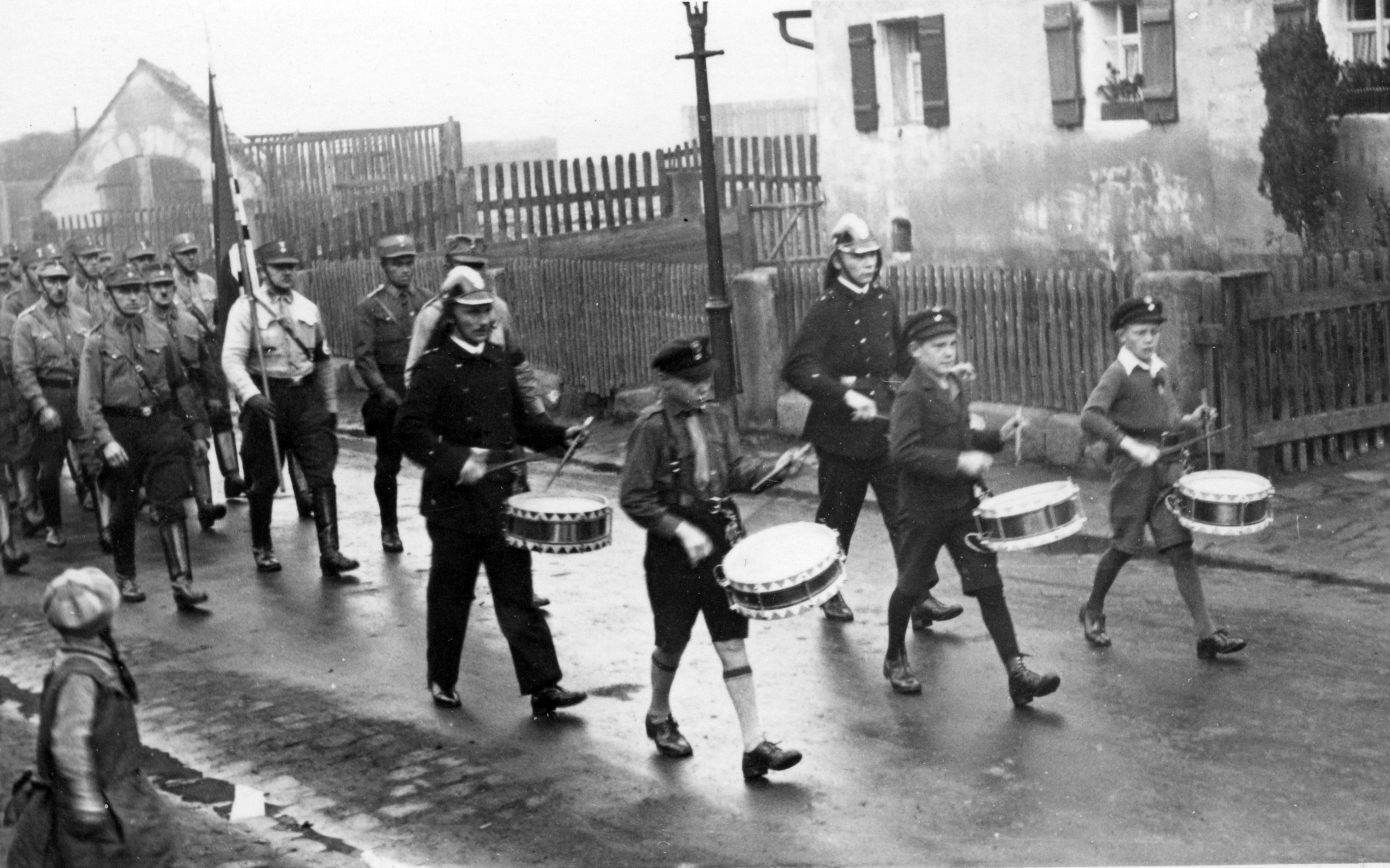| Beschreibung | Feuerwehrumzug mit Trommler (rechts vorne) Leonhard Bär | ||