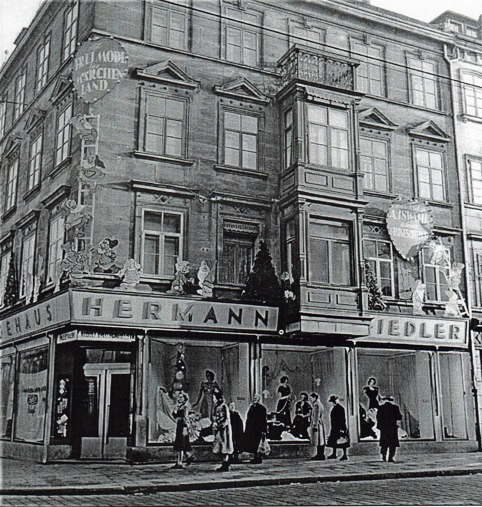 | Beschreibung | Modehaus Fiedler mit Werbung an der Außenfassade, ca. 1940 | ||