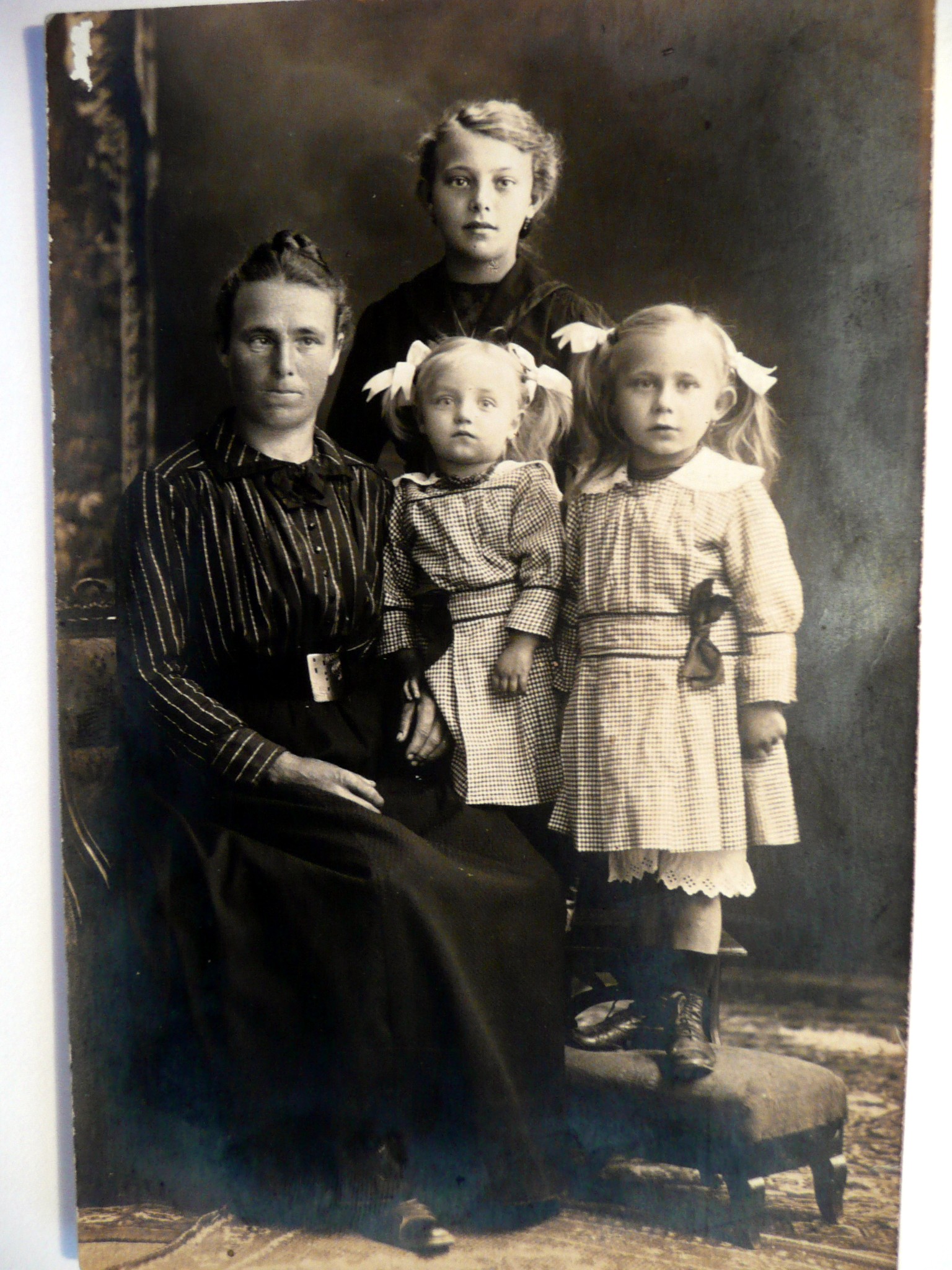 | Beschreibung | Babette (Barbara) Fischer mit ihren drei Töchtern - rechts Tochter Käte (09.07.1913 - 12.07.1972), wohnte im "Schwarzen Adler" Poppenreuth, 1917. Aufnahme Atelier Johannes Ernst Schran | ||