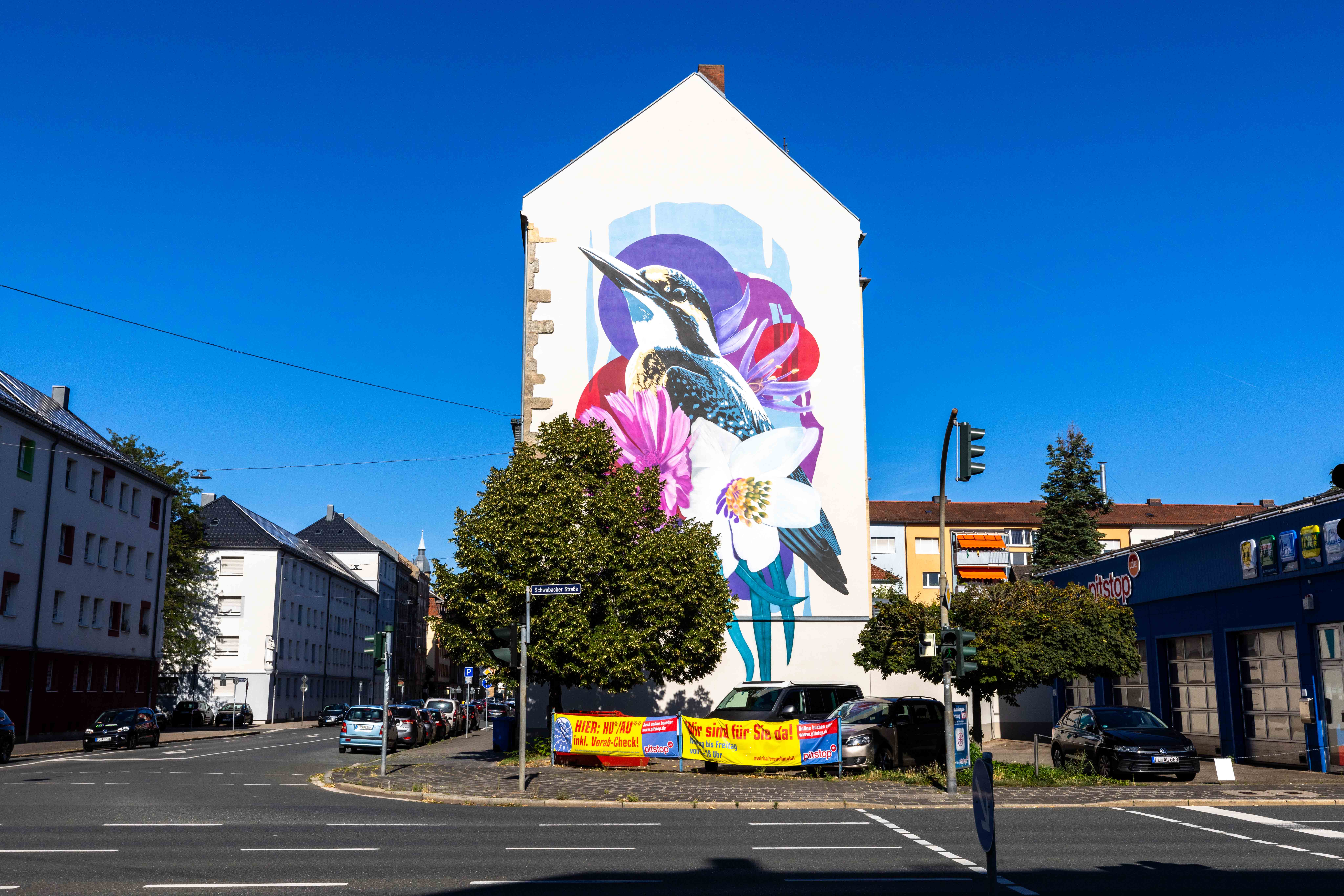 BeschreibungMural an der Fassade des Gebäudes Flößauastraße 34 im Rahmen der Frei Luft Galerie 2024, Aug. 2024