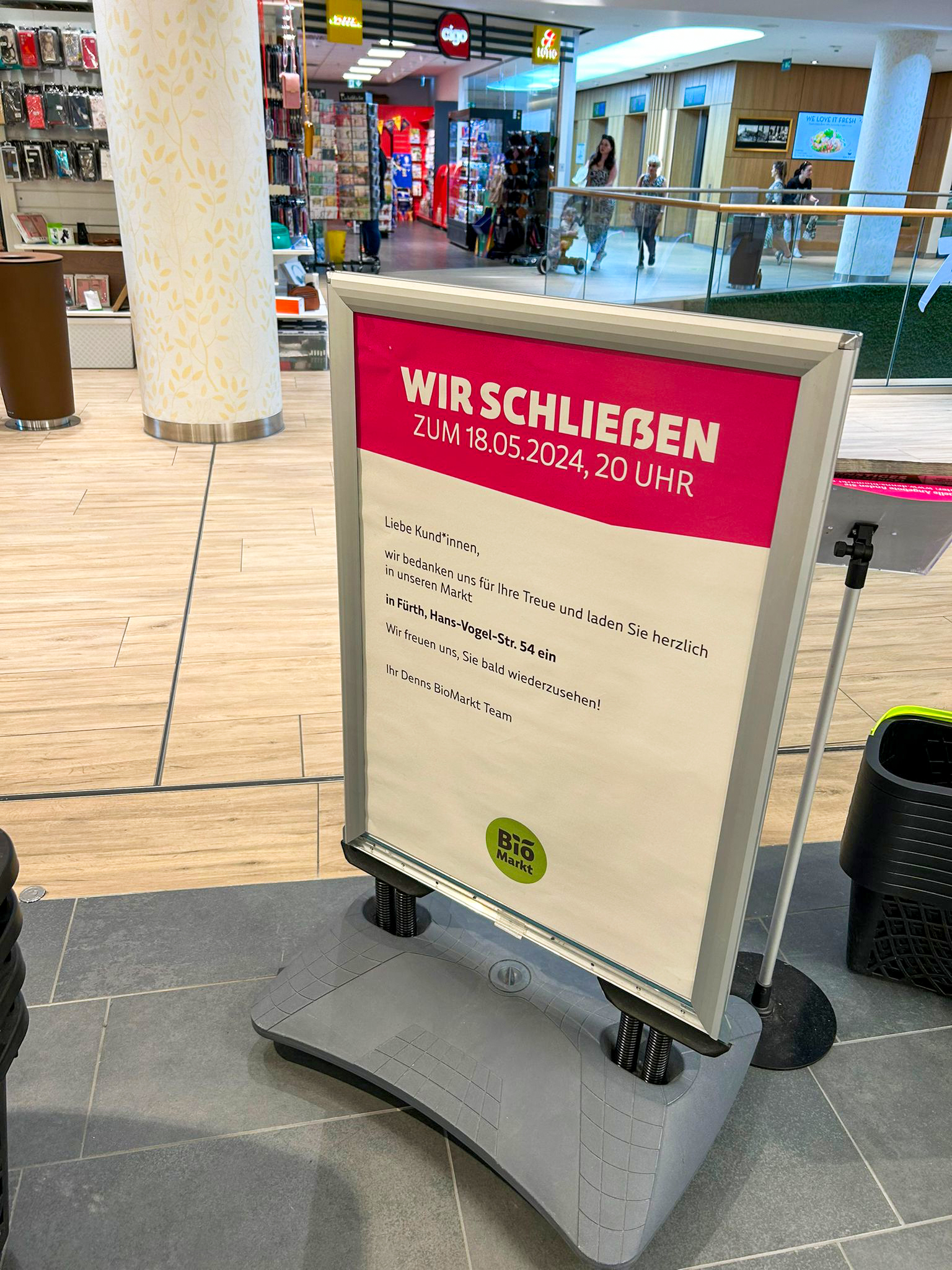 | Beschreibung | Hinweis auf Schließung des Denns Biomarkt im Flair, Mai 2024 | ||