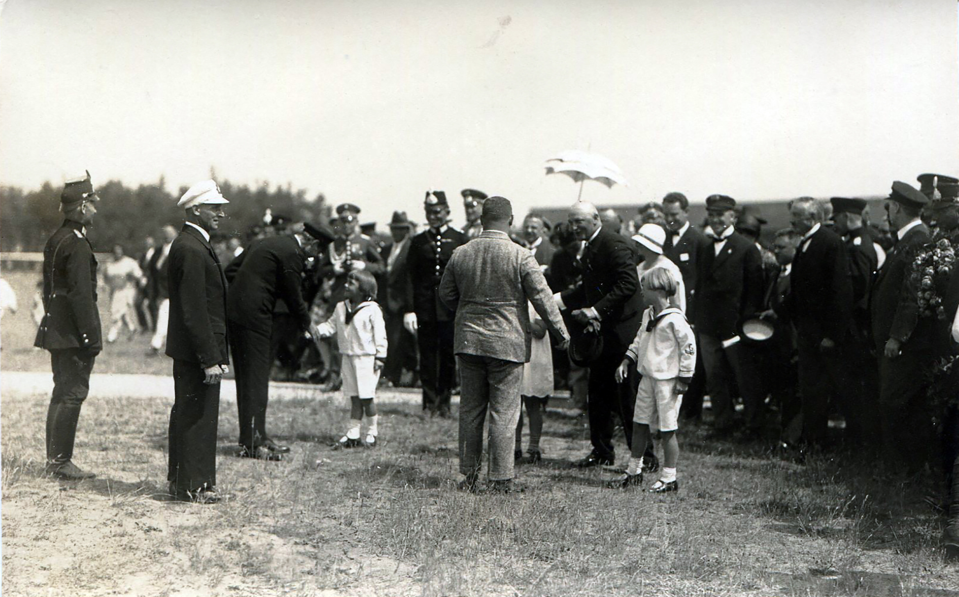 | Beschreibung | Empfang der Flugpioniere Hermann Köhl und Ehrenfried Günther Freiherr von Hünefeld durch den Oberbürgermeister Robert Wild 1928 am Flugtag in Atzenhof | ||