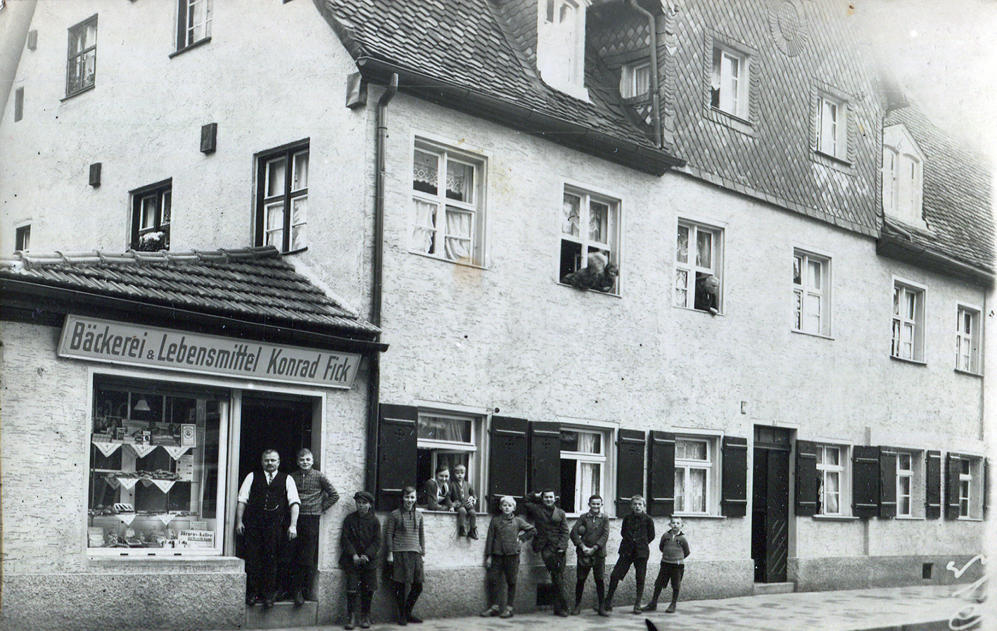 | Beschreibung | Bäckerei Fick im Fraveliershof, in der Tür links: Bäckermeister Konrad Fick | ||